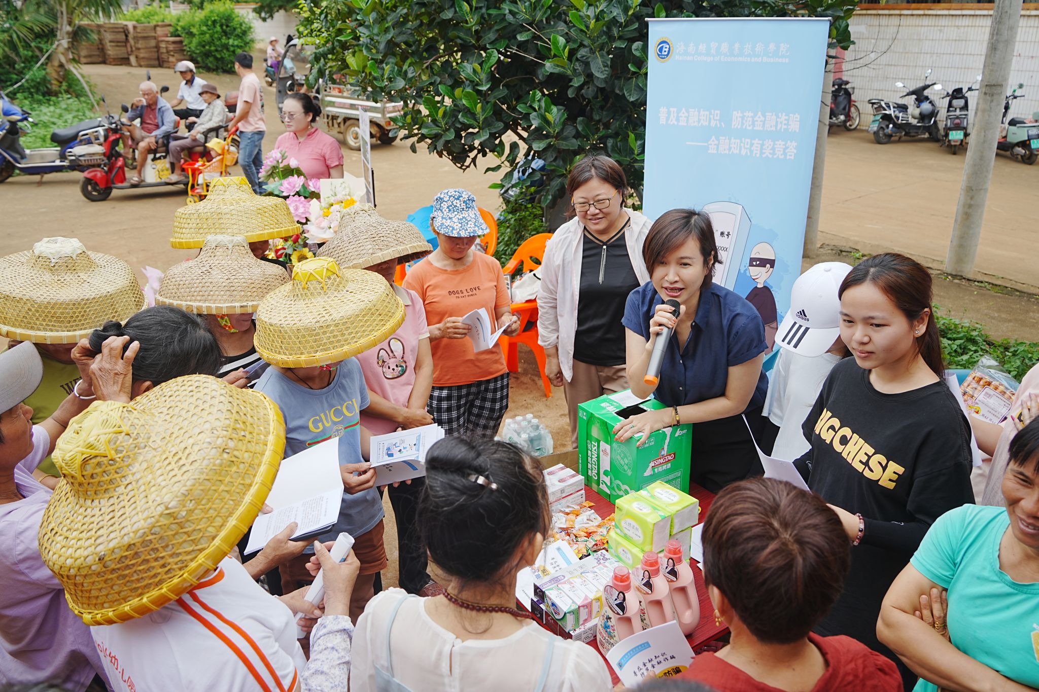 活动现场,财务管理学院的师生们成为金融知识的传播者。他们手持精心制作的宣传册,穿梭在村民中间,耐心地为村民讲解金融知识。为了让村民更好地理解和记忆,师生们还采用有奖问答的形式与村民互动。“如果有人向你借身份证和银行卡,说给你好处费,大家千万注意这是个陷阱,一定要守住自己的钱包。”师生们反复提醒村民防范金融诈骗,村民们积极参与问答,现场气氛热烈。