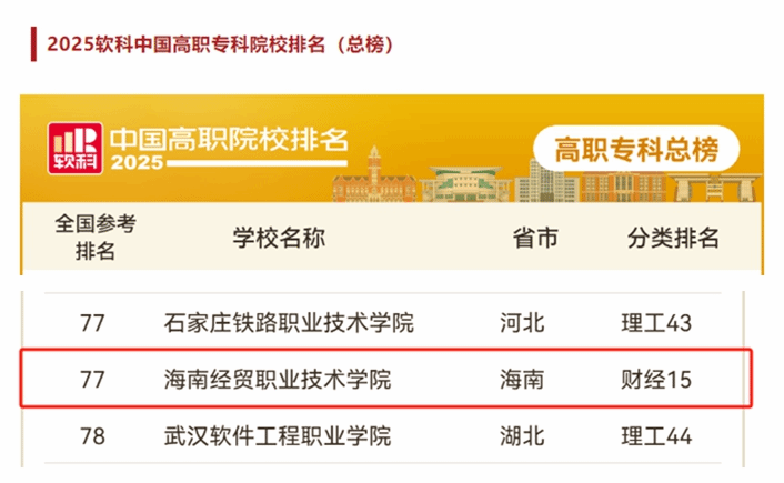 近日,高等教育专业评价机构软科发布“2025软科中国高职院校排名”。bv伟德源自英国始于1946跻身全国高职专科总榜百强,位列第77名,同时在财经类高职院校榜中排名第15名。