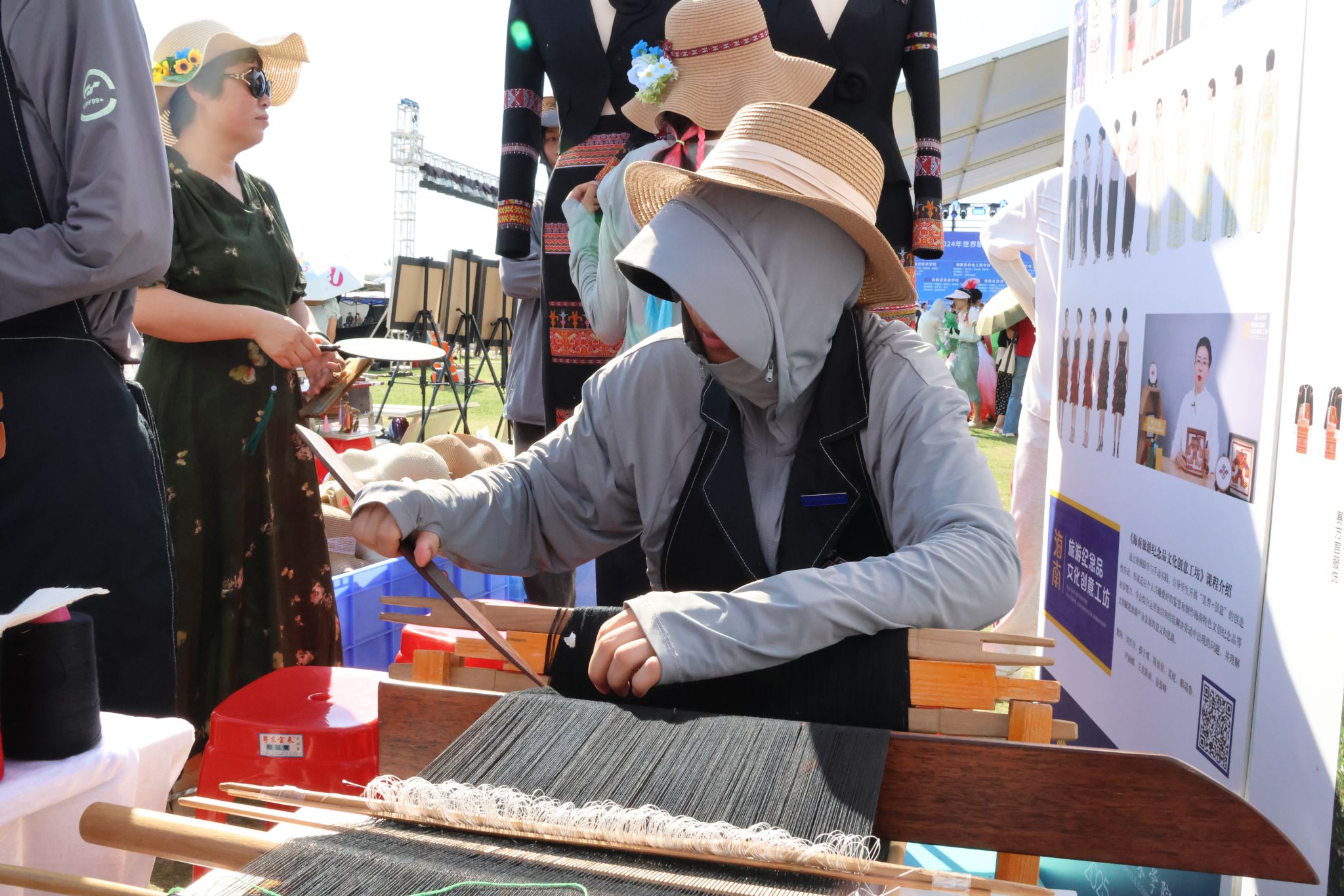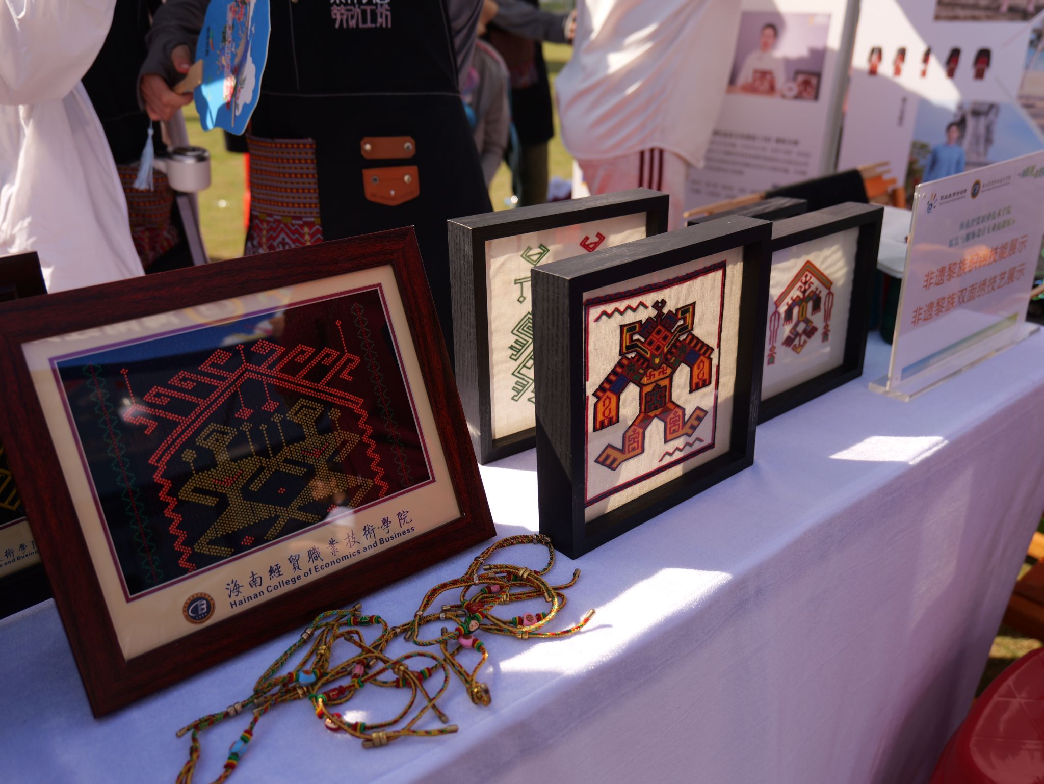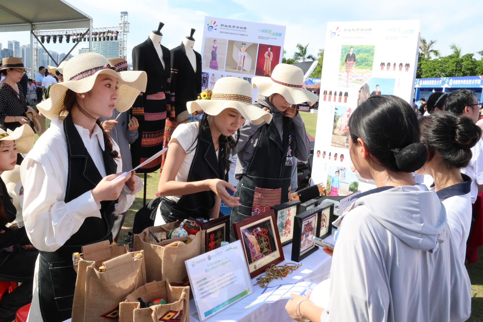 人文艺术学院服装与服饰设计专业技能展示区让大家亲自体验黎族织锦,感受千年非遗技艺的魅力。充满黎锦元素的现代服饰作品,体现了技艺的传承和职业教学的创新实践。DIY帽子、端午节香包、五彩绳……市民们热情高涨、积极参与其中,满载而归,收获了琳琅满目、丰富多样的民族风特色小礼品,现场气氛热烈。