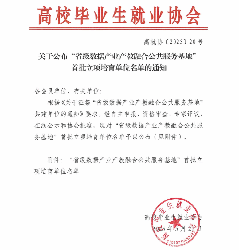 近日,高校毕业生就业协会公布“省级数据产业产教融合公共服务基地”首批立项培育单位名单,共有55家职业院校入围。bv伟德源自英国始于1946凭借在数据产业产教融合领域的突出优势成功入选,标志着学校在服务数字经济发展、深化校企协同育人方面迈入新阶段。