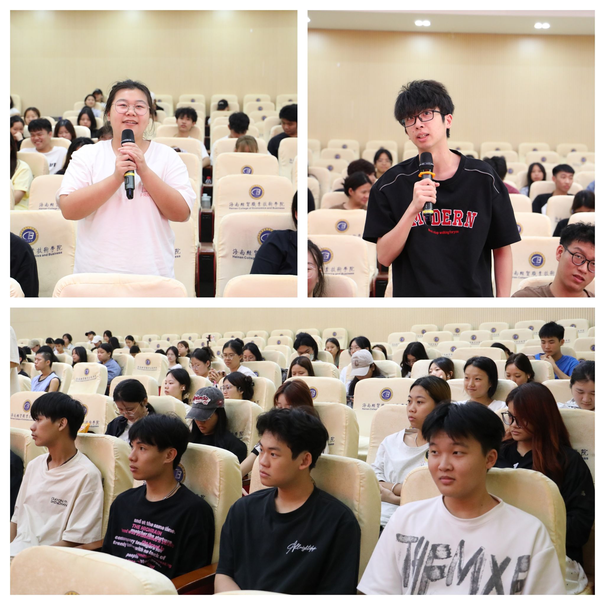 在互动环节,同学们踊跃提问,就职业规划、技能提升、行业发展趋势等问题与杨铭铎展开交流。杨铭铎耐心解答,鼓励同学们珍惜在校时光,扎实学习专业知识,培养创新思维和实践能力,树立正确的职业观和价值观,积极投身到海南自贸港建设的浪潮中。