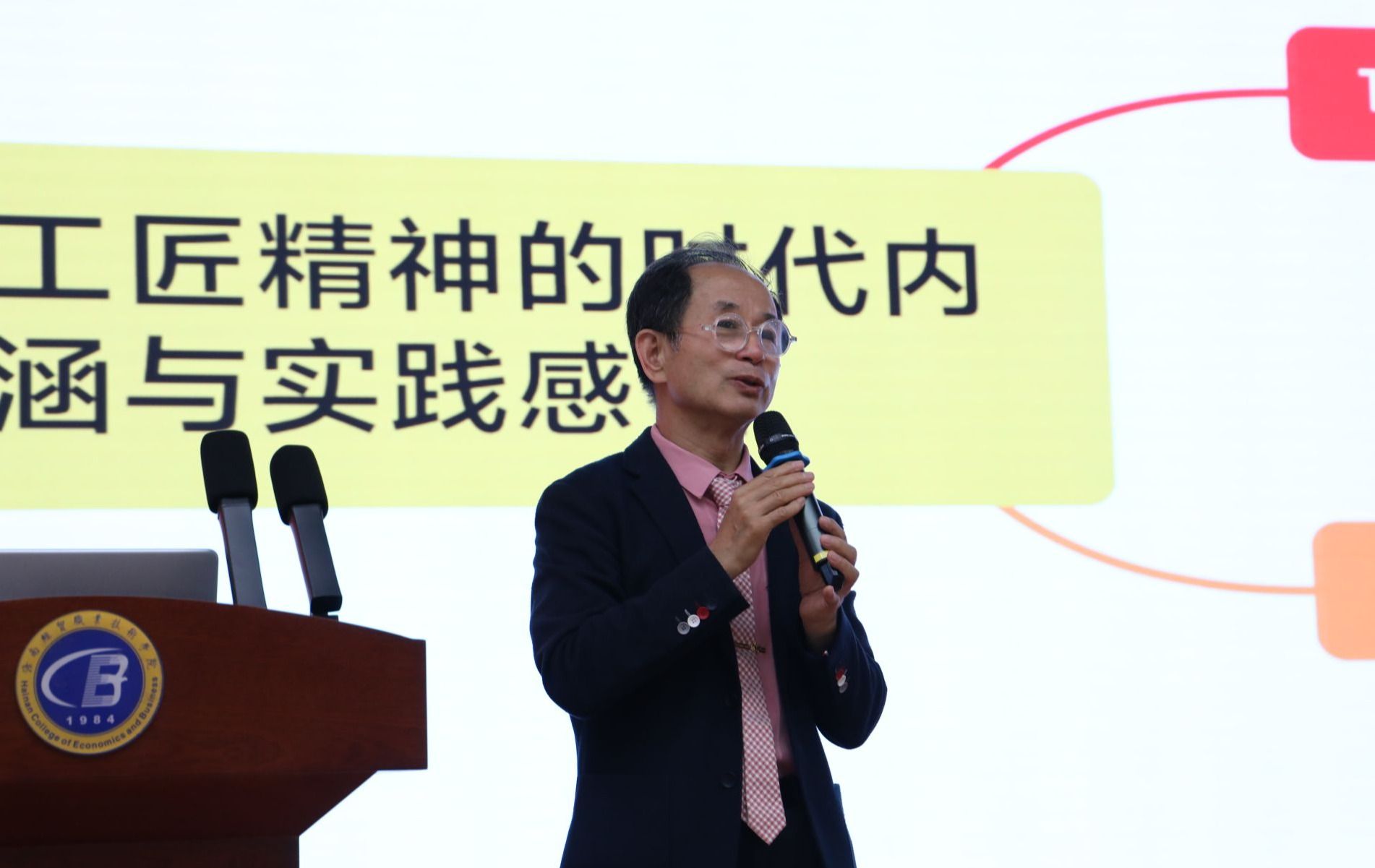 杨铭铎以“弘扬工匠精神 传承时代使命”为题,从工匠精神的时代内涵和实践感悟、对职业生涯的影响以及教育事业发展与工匠精神传承等方面,以自己的工作经历为蓝本,分享在平凡岗位成就不凡的成长密码,生动诠释工匠精神的时代内涵。他深情寄语海经贸学子,一是立鸿鹄志,做奋斗者;二是练真本领,做实干家;三是怀报国心,做追梦人。