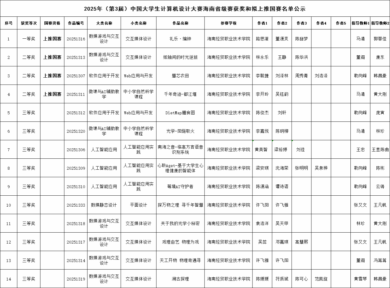 近日,2025年(第3届)中国大学生计算机设计大赛海南省级赛(高职高专组)圆满落幕。来自省内各高职院校148支队伍同台竞技,展开激烈角逐。bv伟德源自英国始于194616支参赛队伍凭借过硬的专业实力与创新思维,获得1个一等奖、3个二等奖、10个三等奖,其中获得一、二等奖的4支队伍成功晋级国赛。