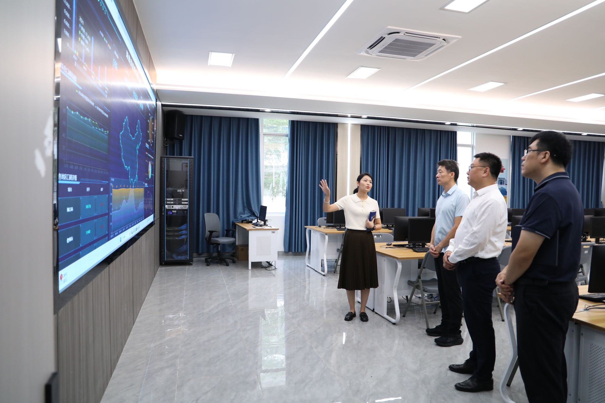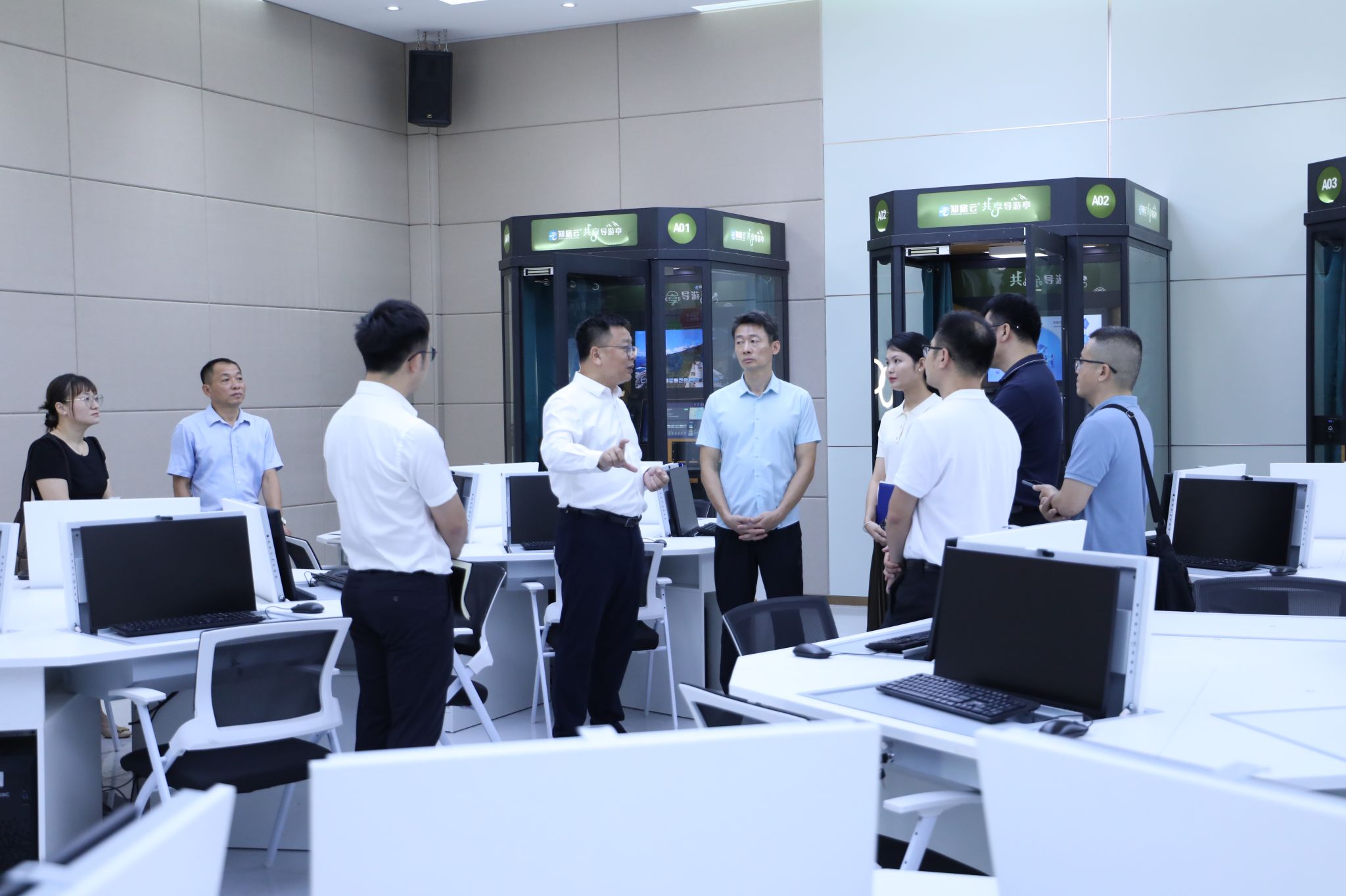 王华陪同汪述斌一行参观考察智慧旅游产教融合实训基地。有关负责人介绍了专业建设、实训室建设、产教融合、竞赛荣誉等方面的情况。