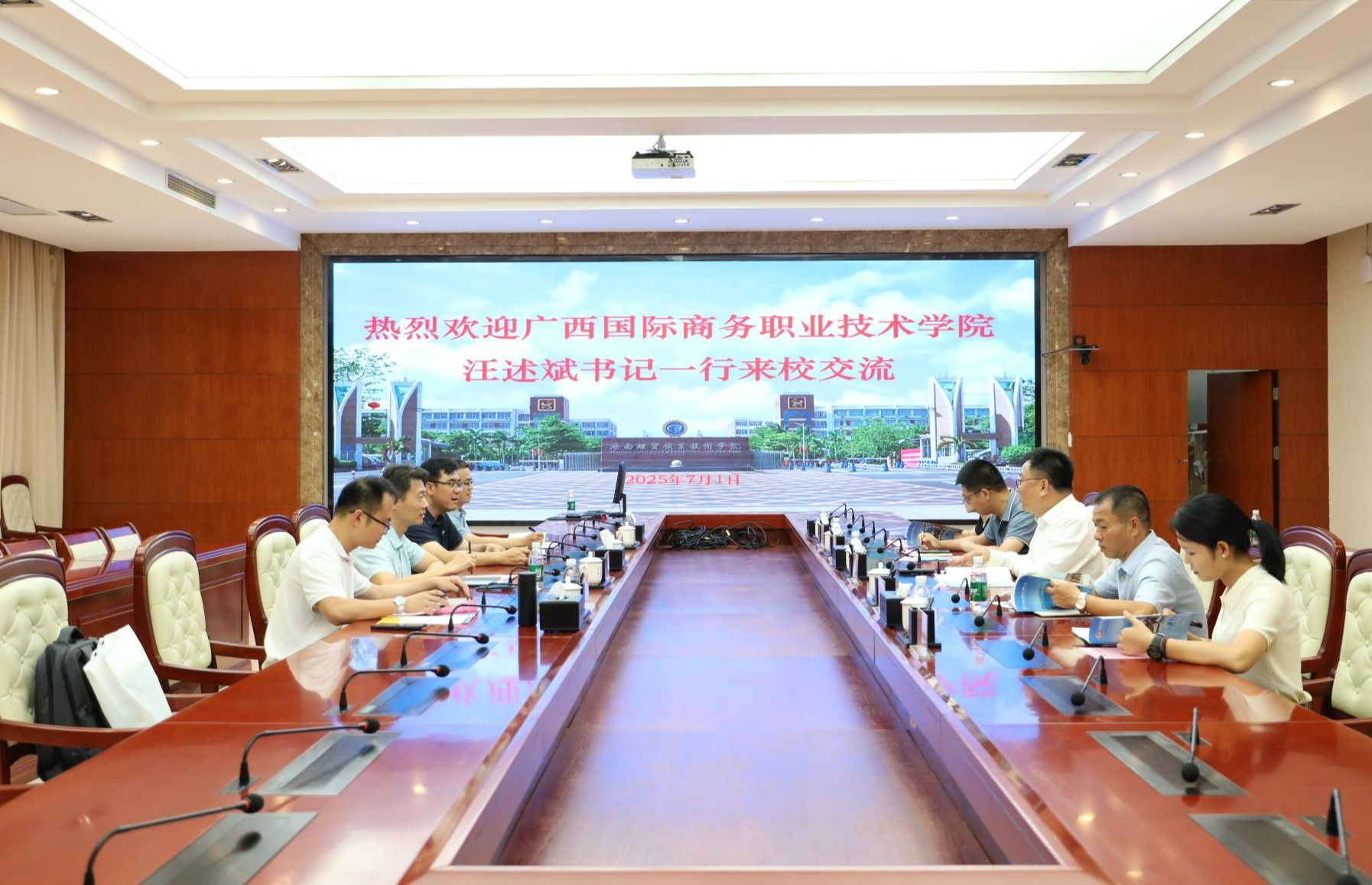 2025年7月1日,广西国际商务职业技术学院党委书记汪述斌一行4人来到bv伟德源自英国始于1946,交流“双高”建设、产教融合、校企合作等相关工作经验。学校党委书记王华热情接待了汪述斌一行。