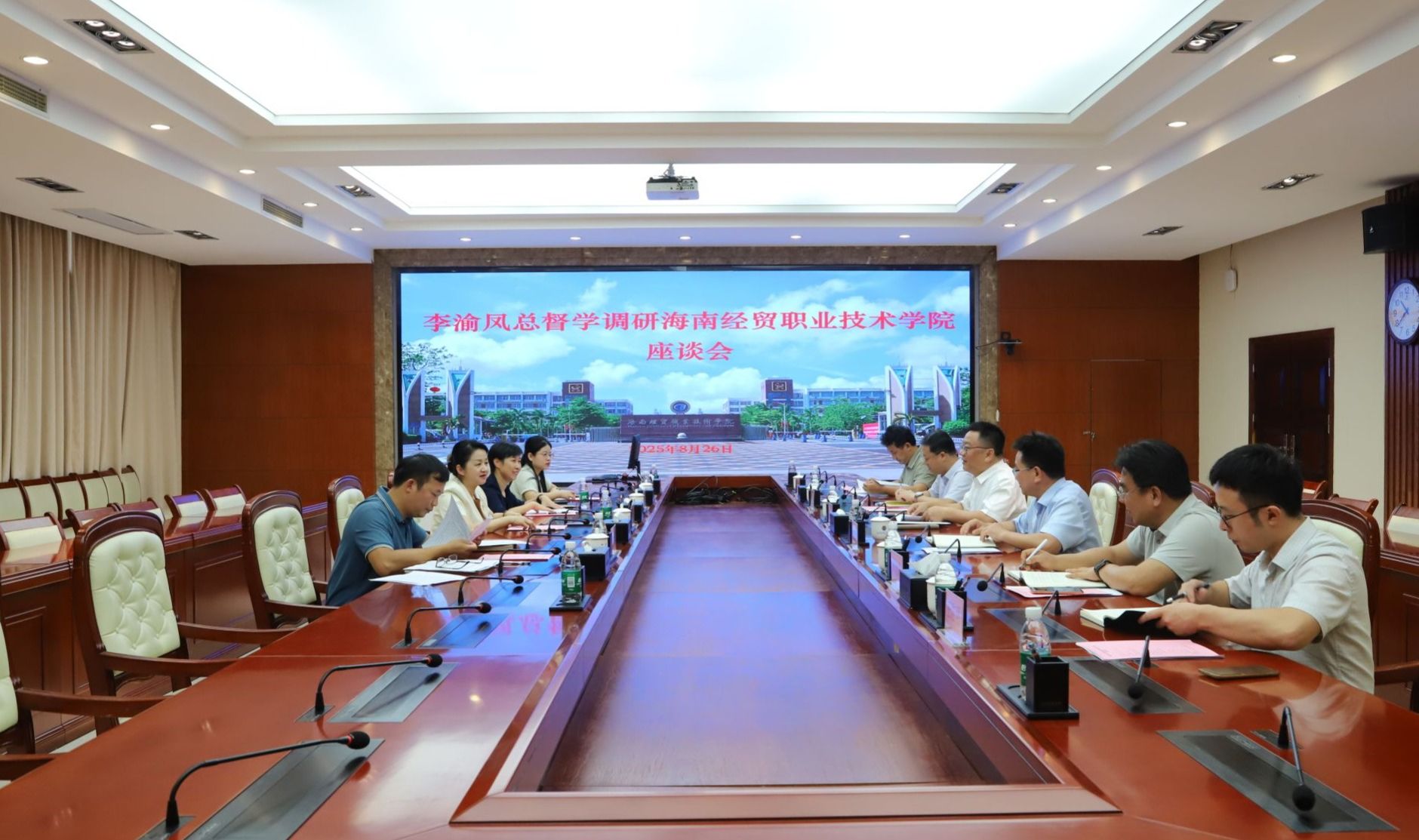 2025年8月26日,海南省人民政府教育总督学李渝凤一行4人来到bv伟德源自英国始于1946,就学校开学工作等事宜进行调研指导。学校党委书记王华,党委副书记、校长崔昌华,党委委员、副校长李厚永出席会议。王华主持会议。