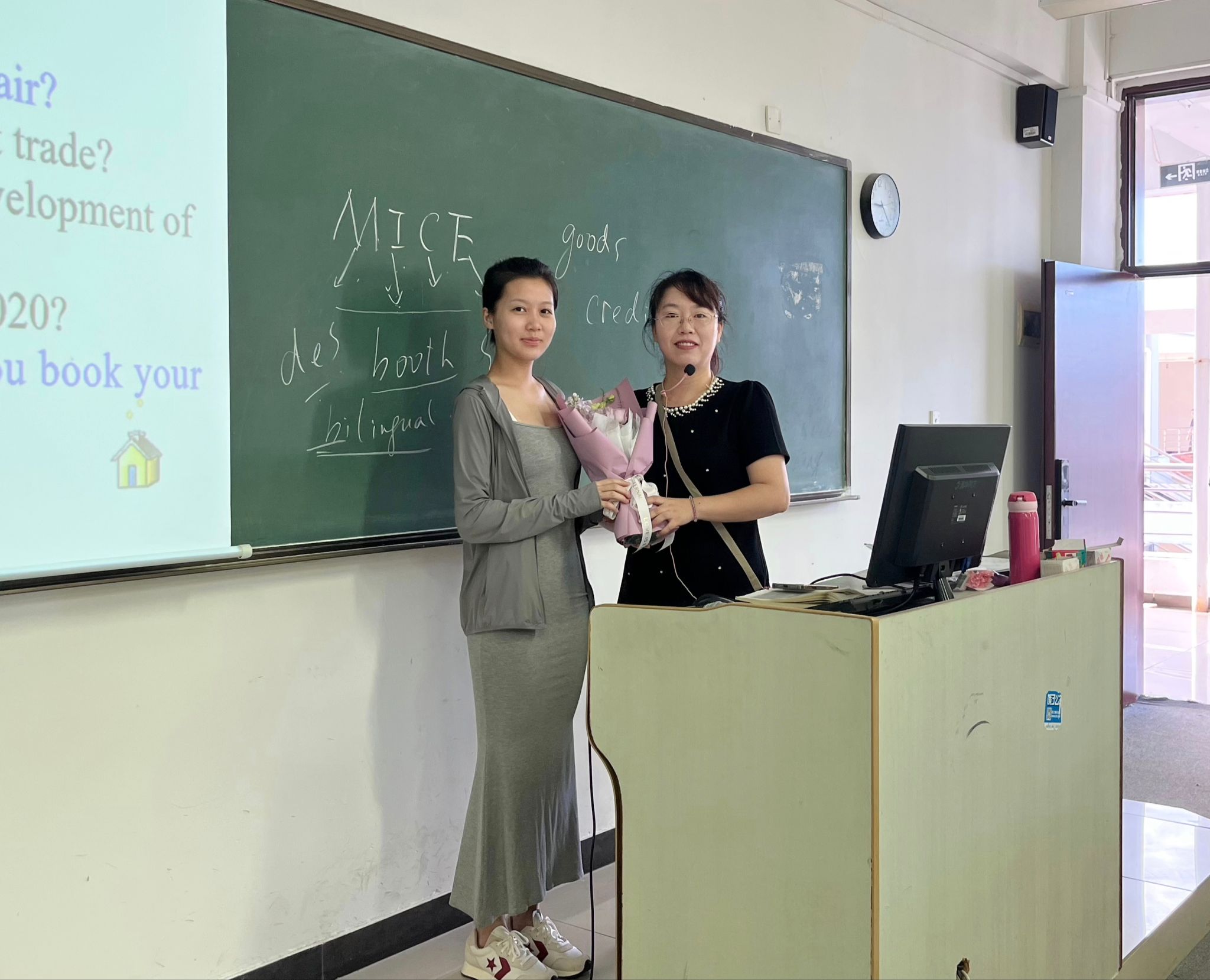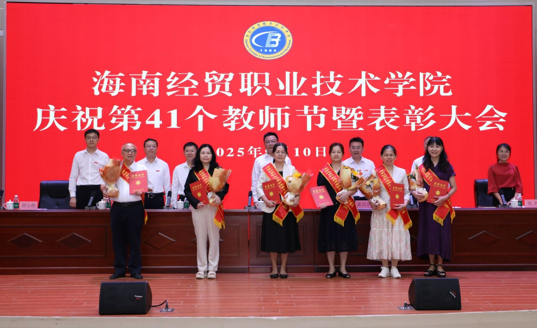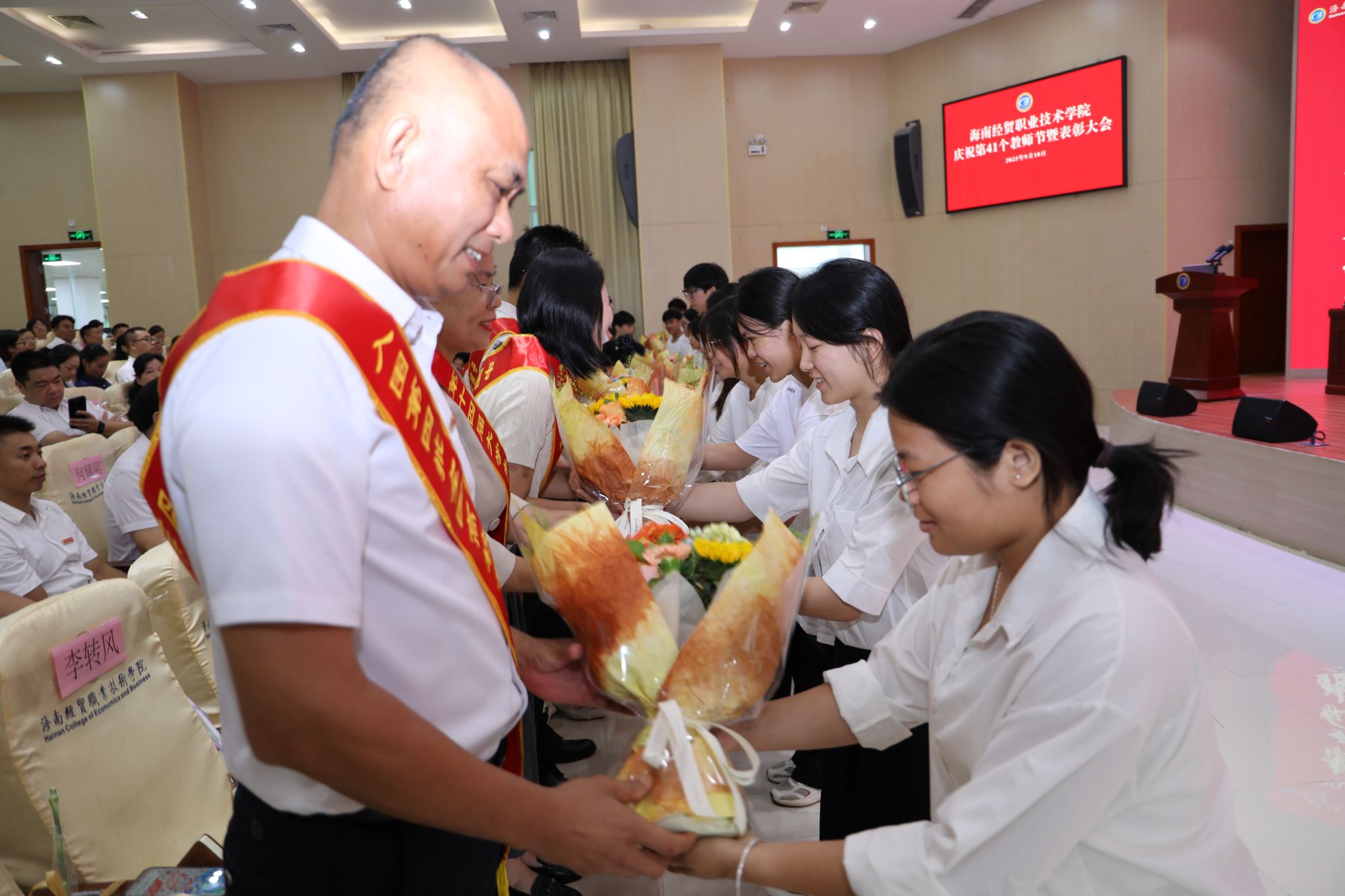 会场内掌声阵阵、热烈持久。受表彰的教师们依次走上领奖台,在师生的瞩目下领取荣誉证书和鲜花。