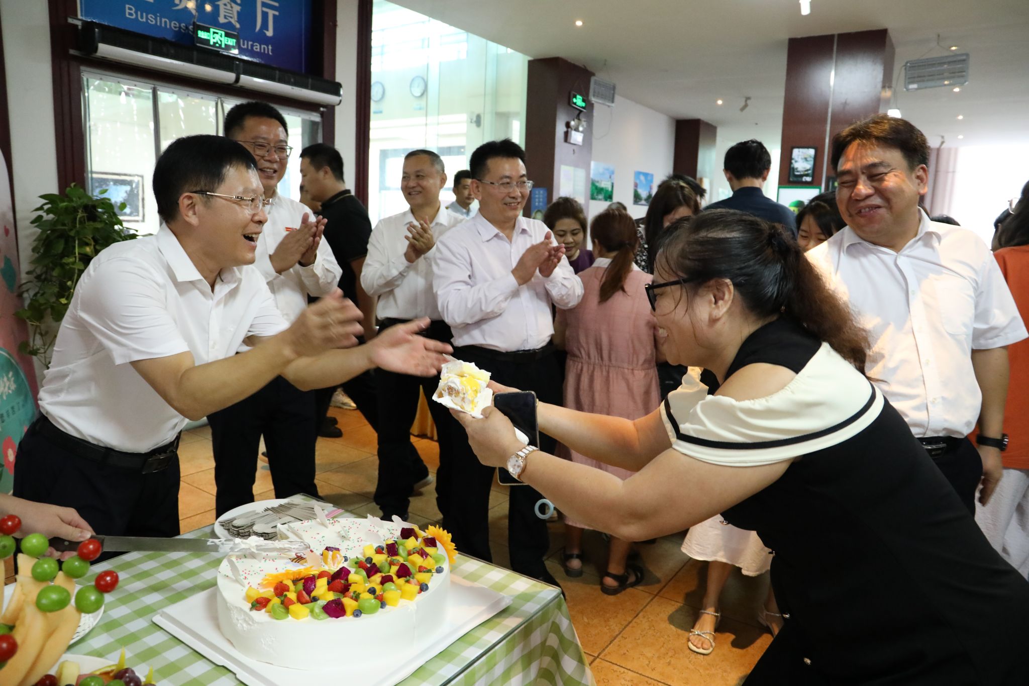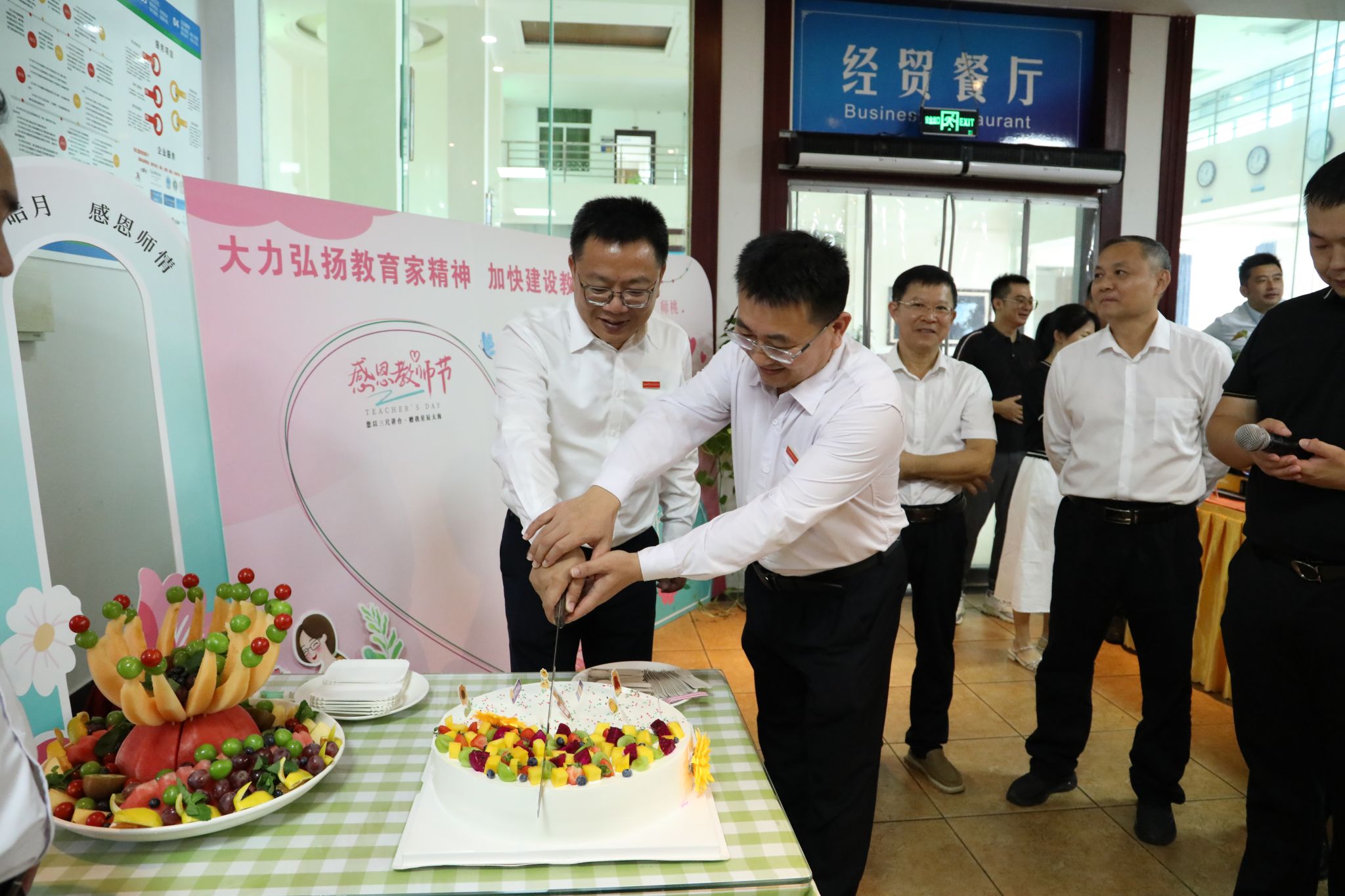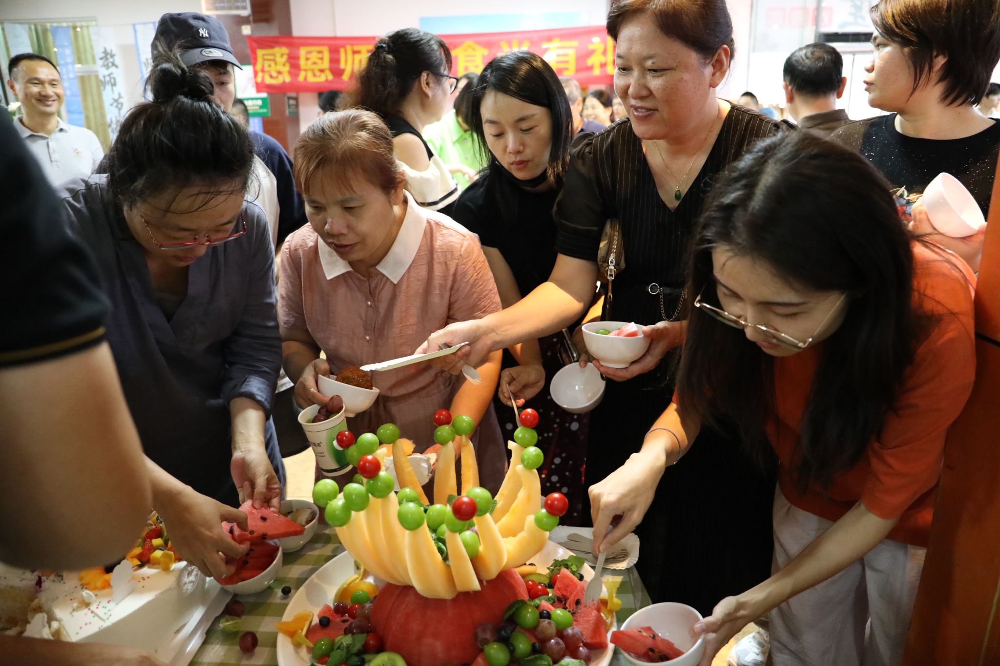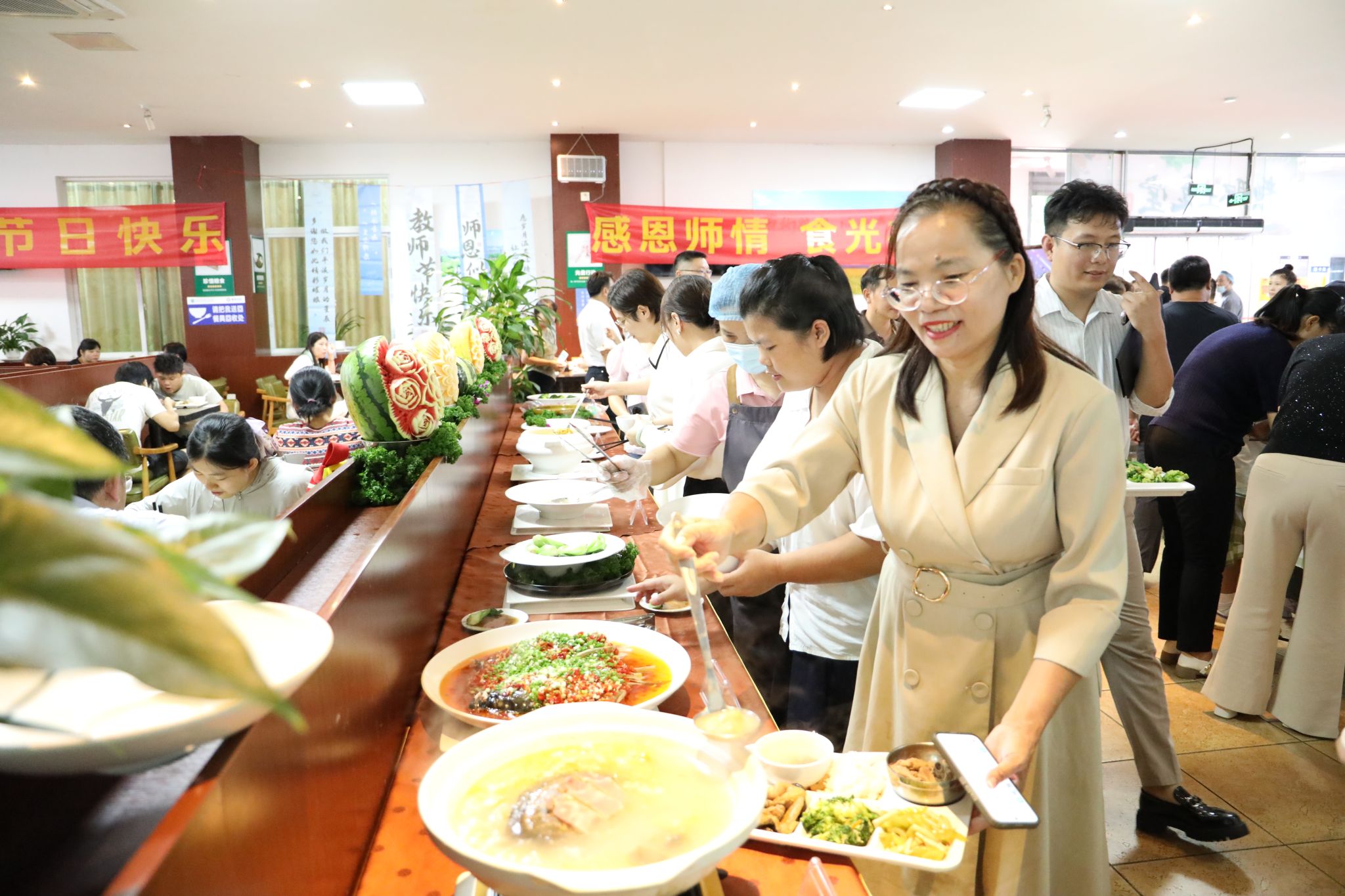在食堂,校领导为老师们切分节日蛋糕,将学校的关怀与祝福传递到每位教职工心中。