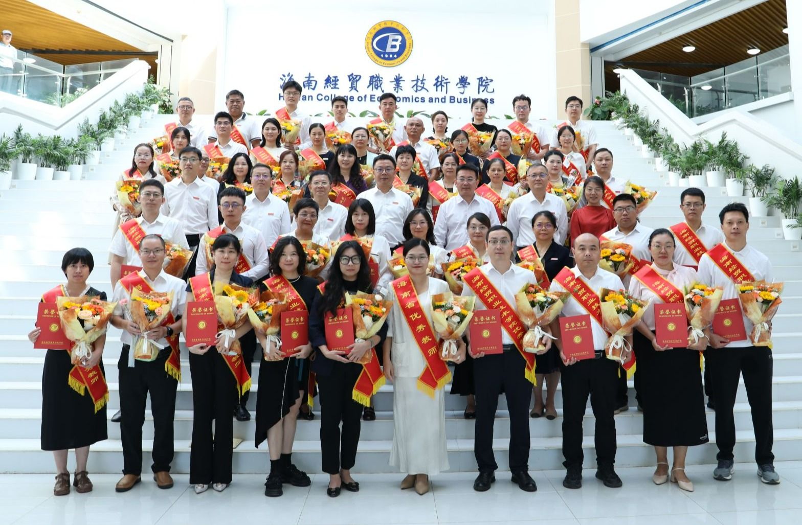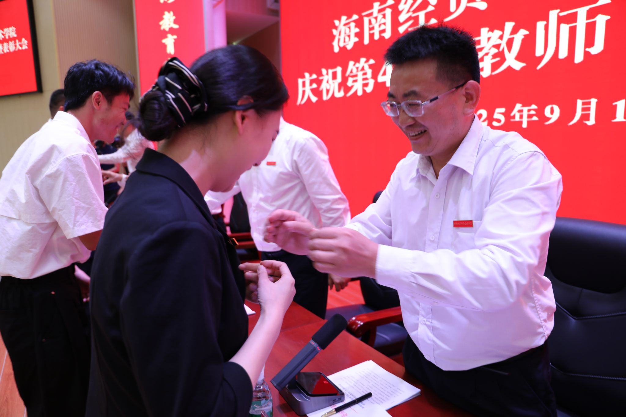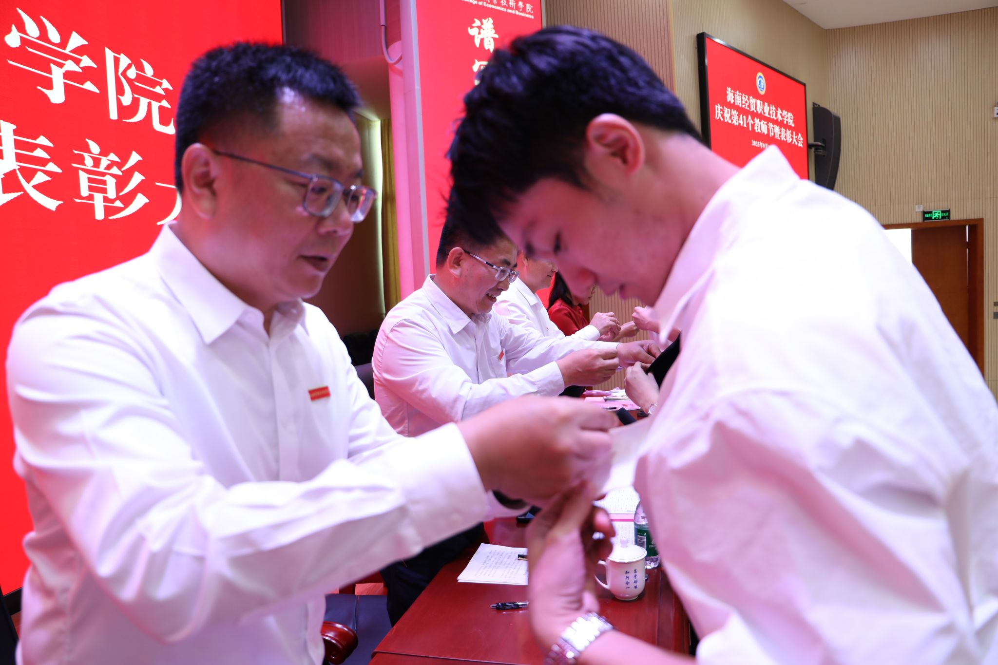 汇聚新力量,共赴新征程。从去年9月至今,全校共迎来28名新教师,为学校发展注入了新鲜血液。为欢迎他们加入海经贸大家庭,学校特在表彰大会上举行入职仪式。校领导为新入职教师代表佩戴学校徽章。