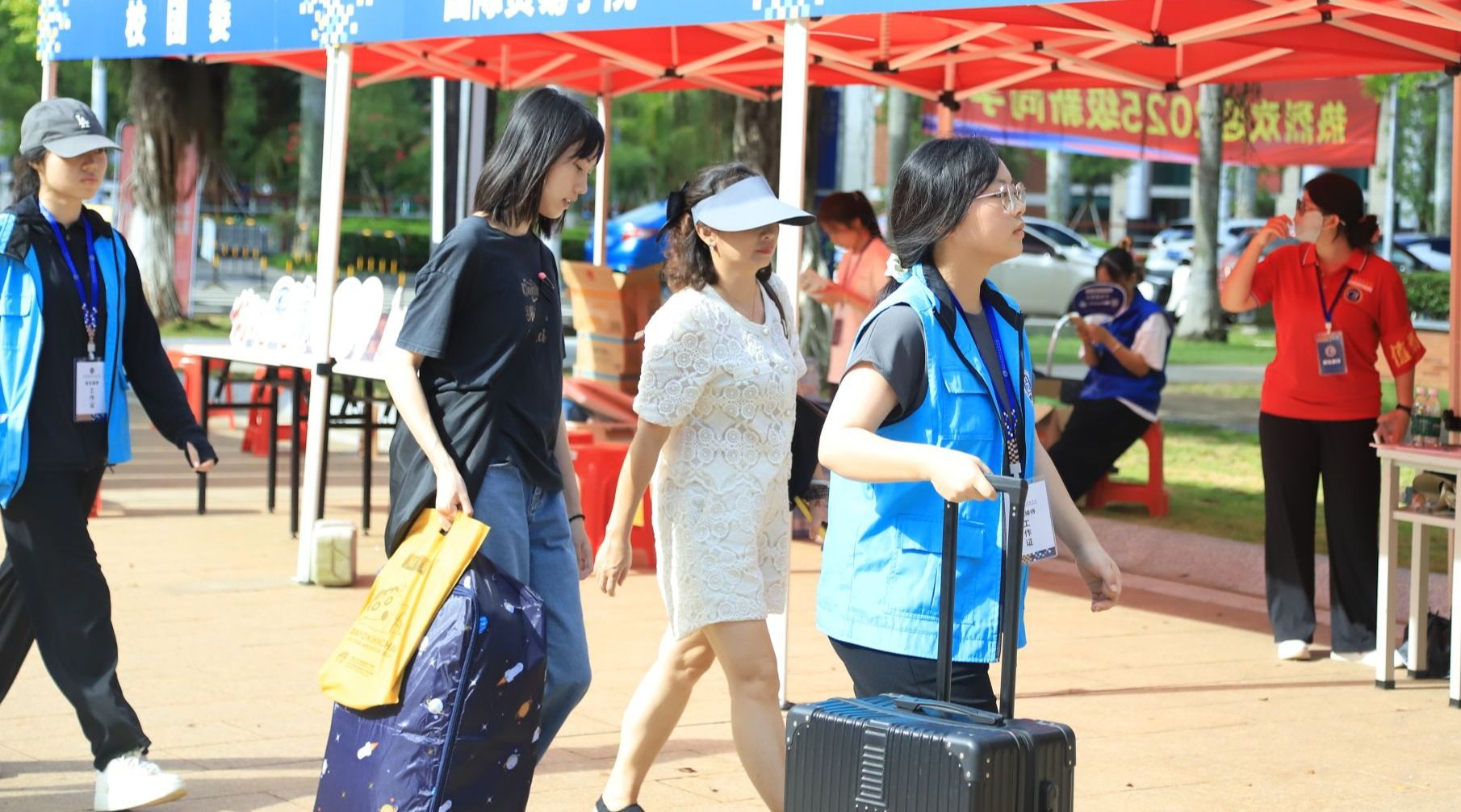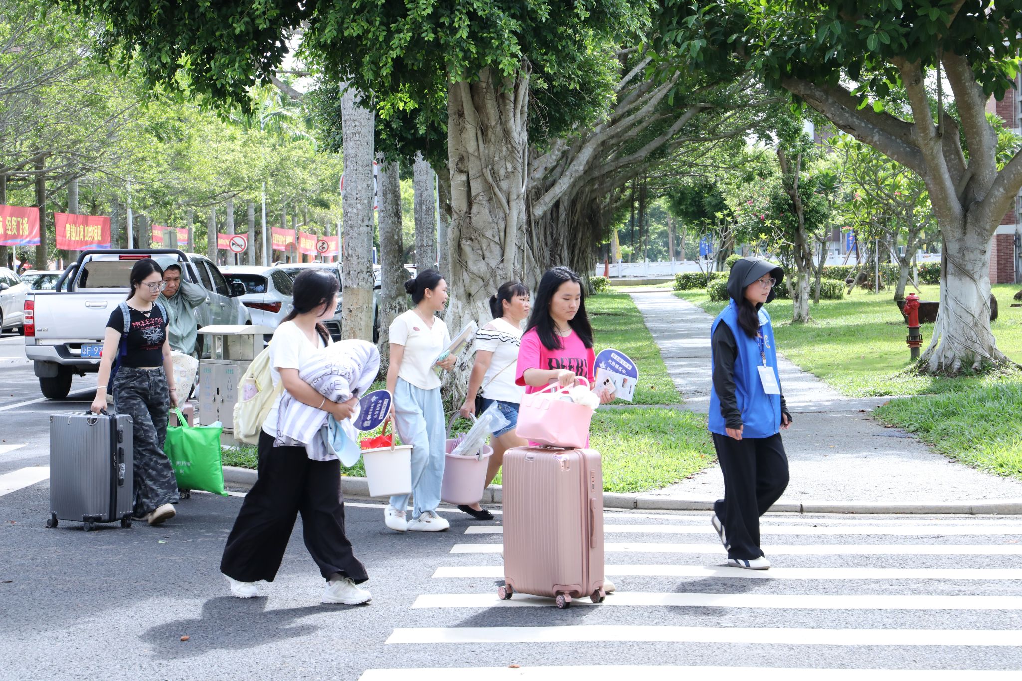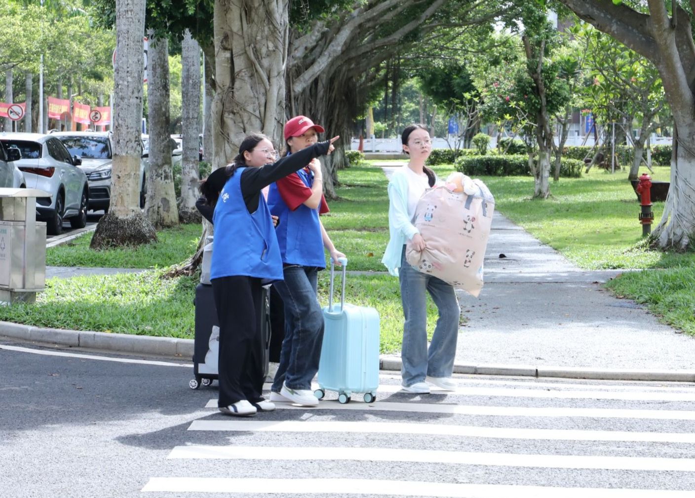 校园外,志愿者们早早来到美兰机场、高铁站、海口火车站、汽车站等接站点,为远道而来的新生及家长送来了最贴心的“见面礼”。校园内,志愿者们手举指示牌和引导标识,为新生们指引自己所属的学院和专业报到点。各学院迎新工作人员热情周到,耐心地为新生办理入学手续,解答各种疑问,帮助新生们搬运行李、入住宿舍。