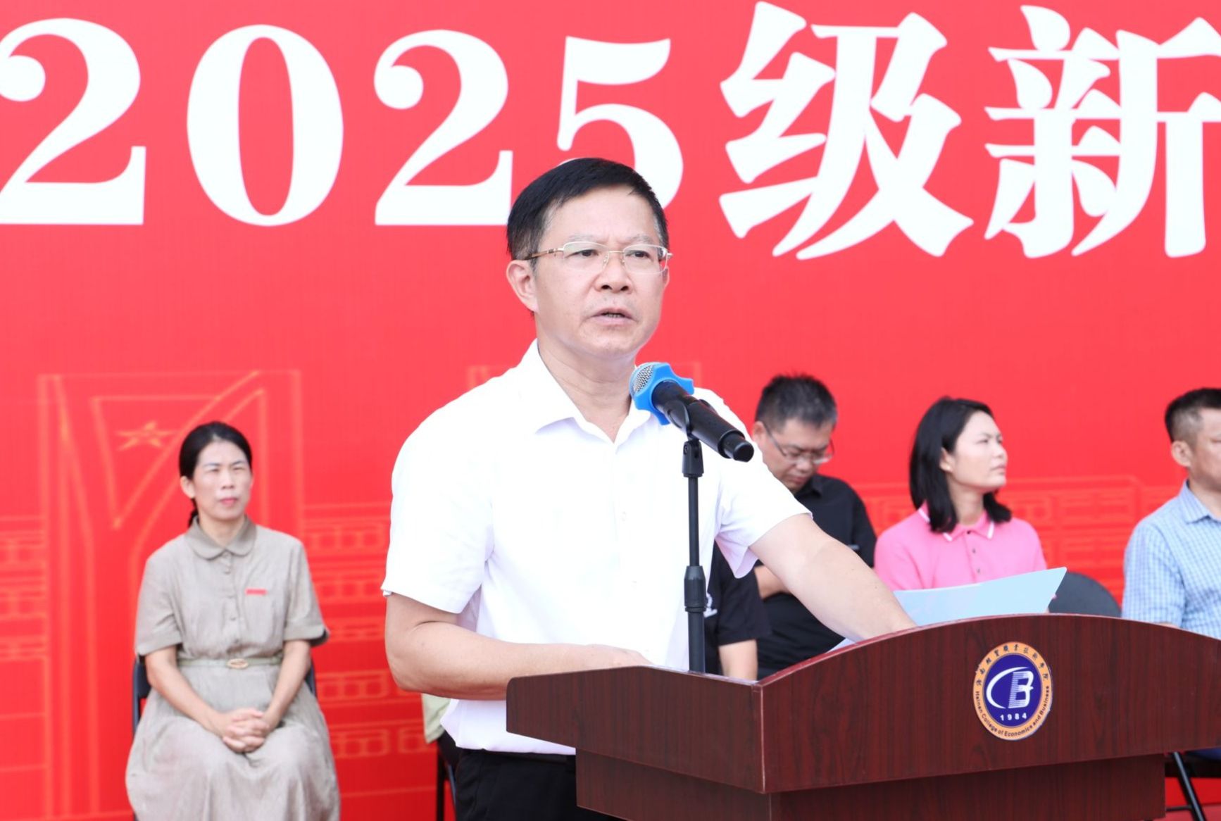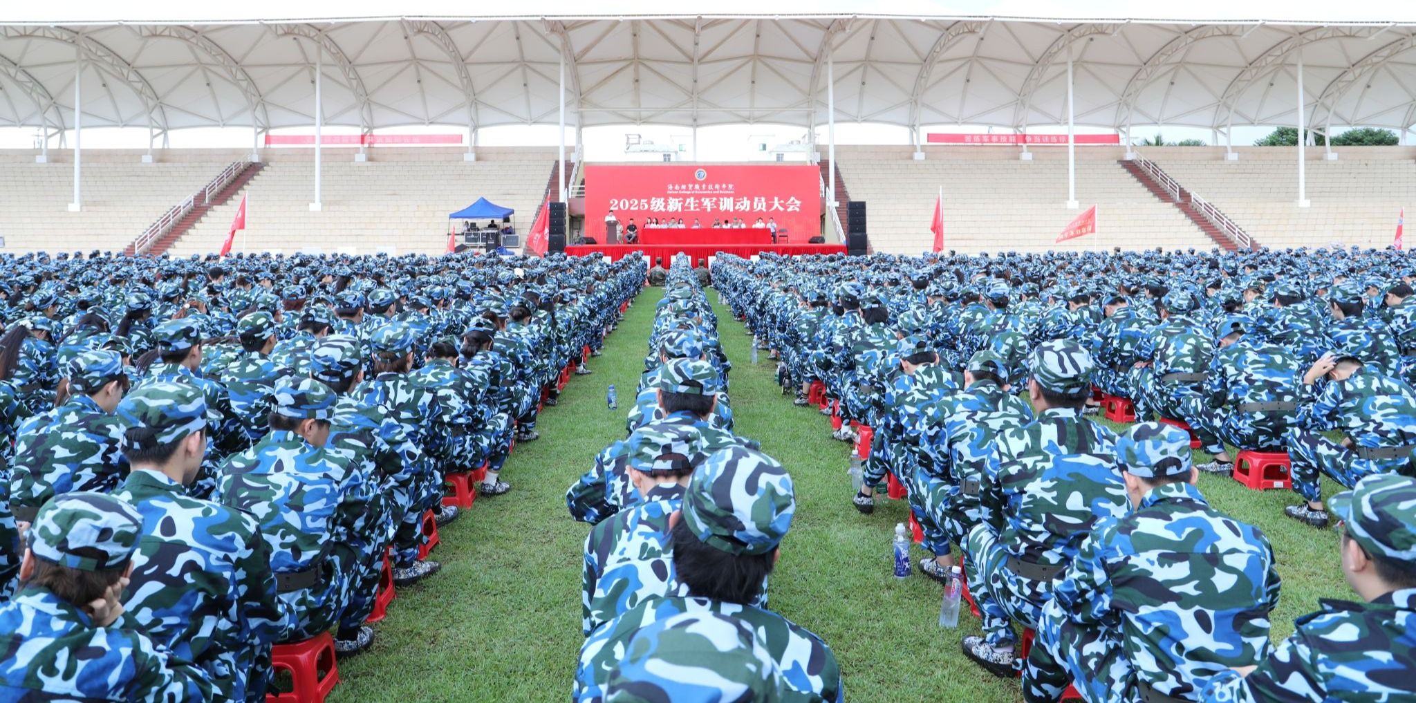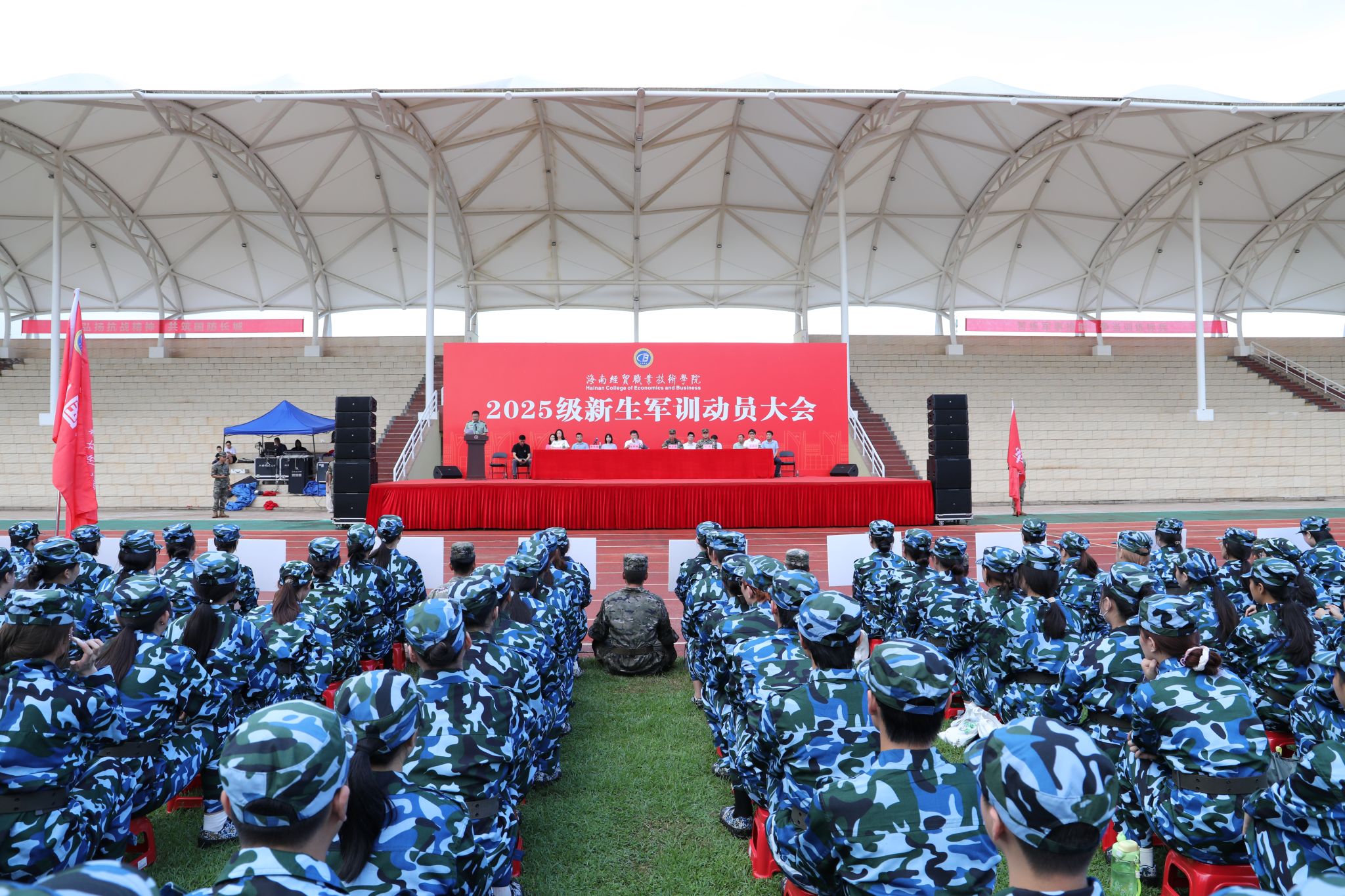 陈修焕向加入海经贸大家庭的新同学表示热烈欢迎,向为本次军训辛勤付出的老师们致以衷心感谢,向承担本次军训任务的全体教官致以崇高的敬意。他说,强国必先强军,强军必先强教,青年必担其责。军训正是大学阶段国防教育的第一课,是青年学子感受军人作风、理解国家安全、树立家国情怀的关键起点。希望同学们在坚持中锤炼意志,以“韧”克难;在标准中追求卓越,以“严”律己;在集体中凝聚力量,以“纪”促行。以饱满的热情、昂扬的斗志和坚定的行动,圆满完成军训任务,展现新时代海经贸人的青春风采。