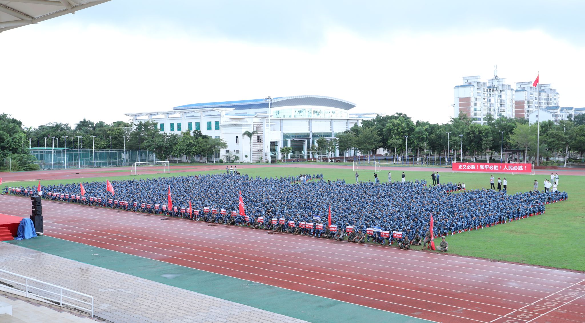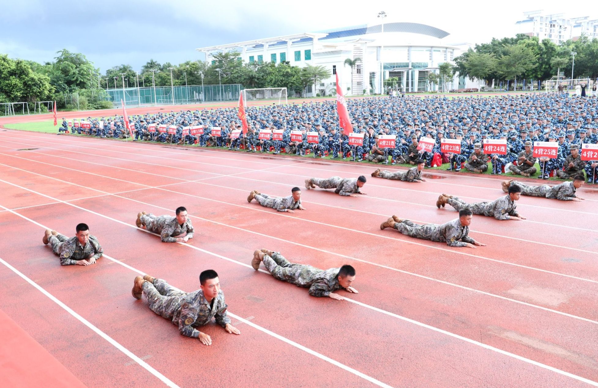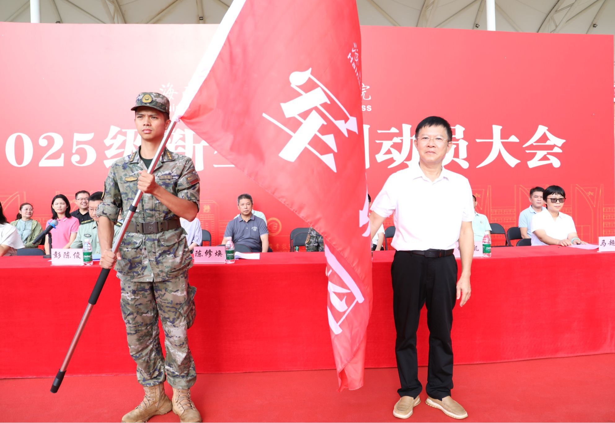 动员大会上,陈修焕向军训团授团旗。军训教官带来了倒功和擒摔课目等精彩的军事课目展示。