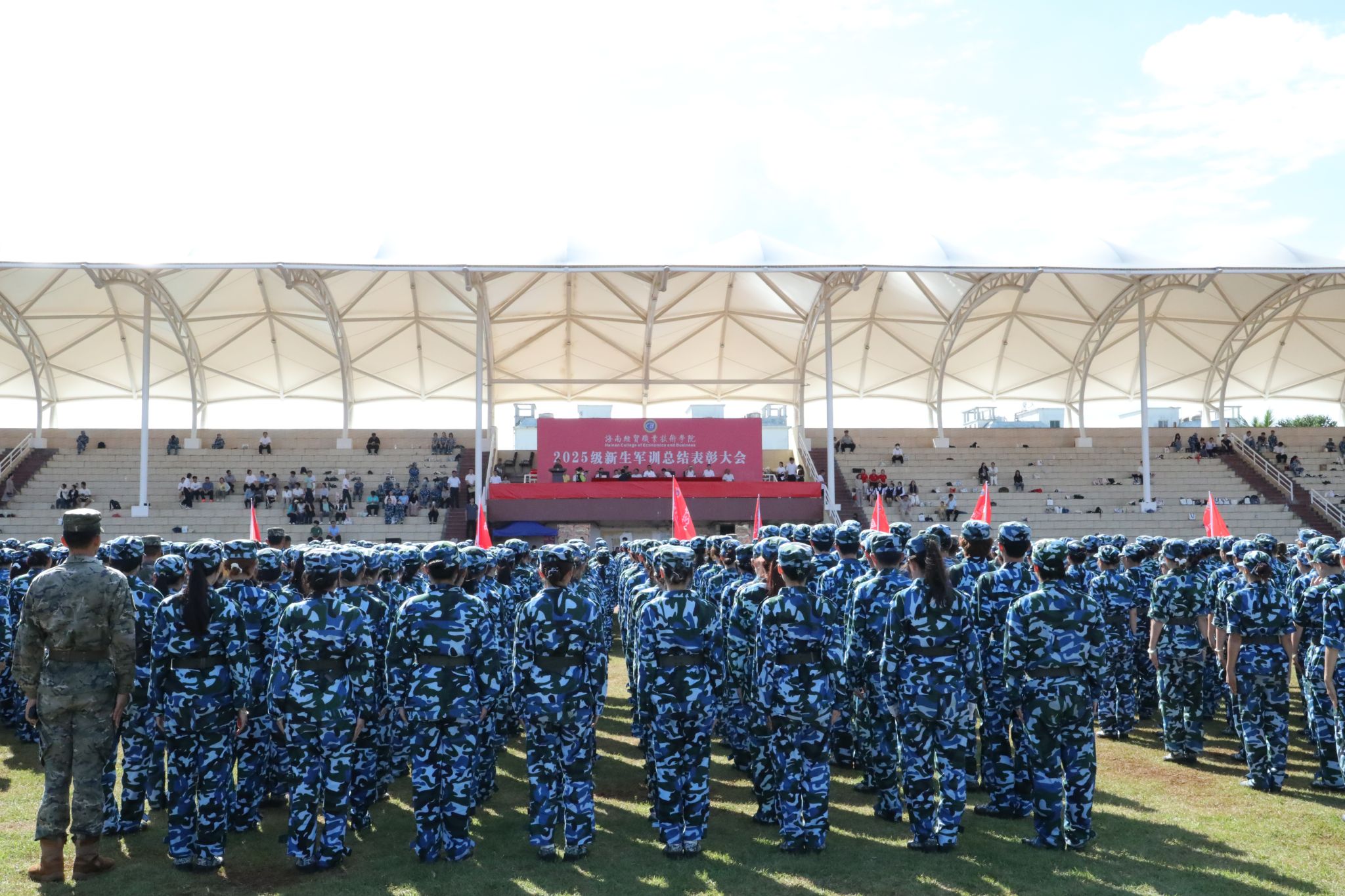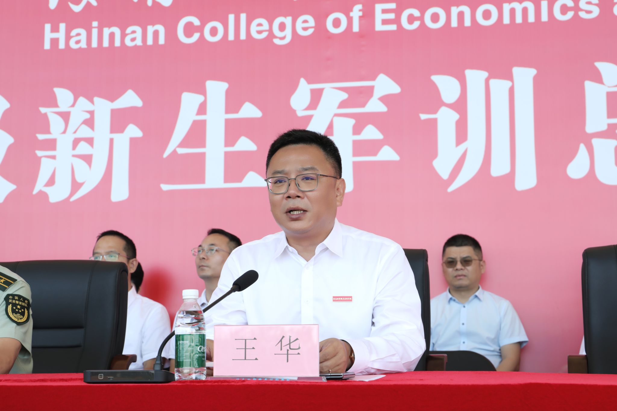 王华代表学校向顺利完成军训任务的全体新同学表示热烈祝贺,向付出艰辛努力的承训部队全体官兵致以崇高的敬意,向全程坚守、辛勤付出的各位老师和工作人员表示诚挚感谢。他说,同学们用行动诠释了“风雨砺筋骨、艰险愈向前”的硬核担当,这份用汗水浇灌的成长,用拼搏铸就的荣光,已然成为海经贸校园最动人的风景。同学们在这堂特殊的“大学第一课”,不仅锤炼了体魄,洗礼了精神,更升华了意志,交上了大学生涯第一份优秀的答卷。