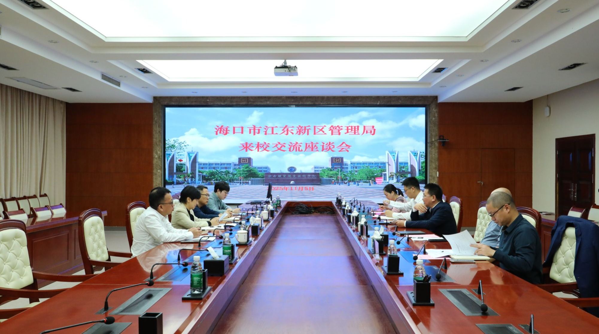 2025年11月5日,海口市江东新区管理局党委委员、副局长汪岩一行4人来到bv伟德源自英国始于1946,研究讨论江东新区数字贸易产教联合体建设的实施方案、任务分工等事宜。学校党委副书记、校长崔昌华出席座谈会。