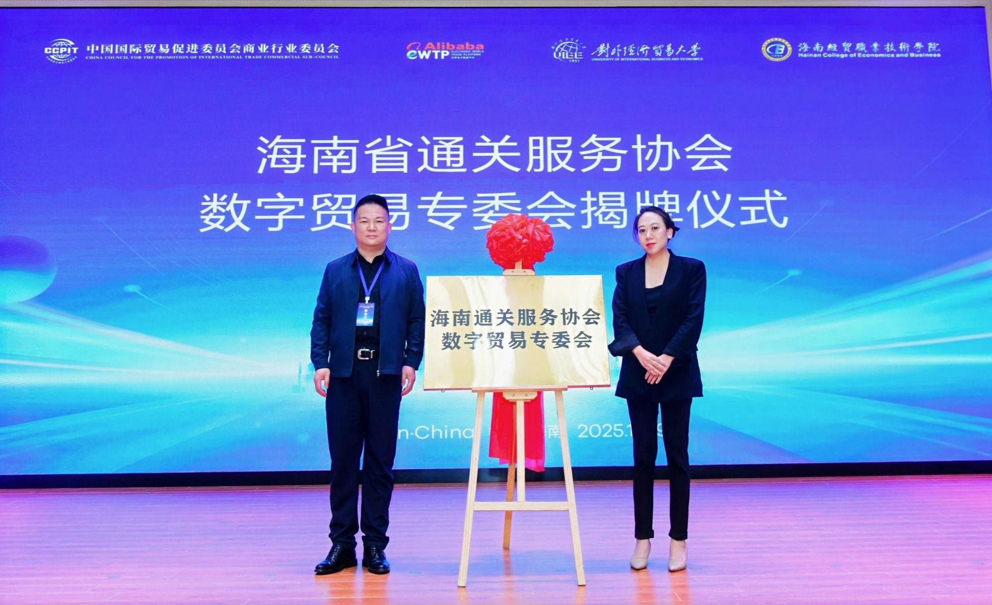 海南省通关服务协会秘书长云娇与湖北省电子商务学会副会长、湖北经济学院教授毛志斌为“海南通关服务协会数字贸易专委会”揭牌