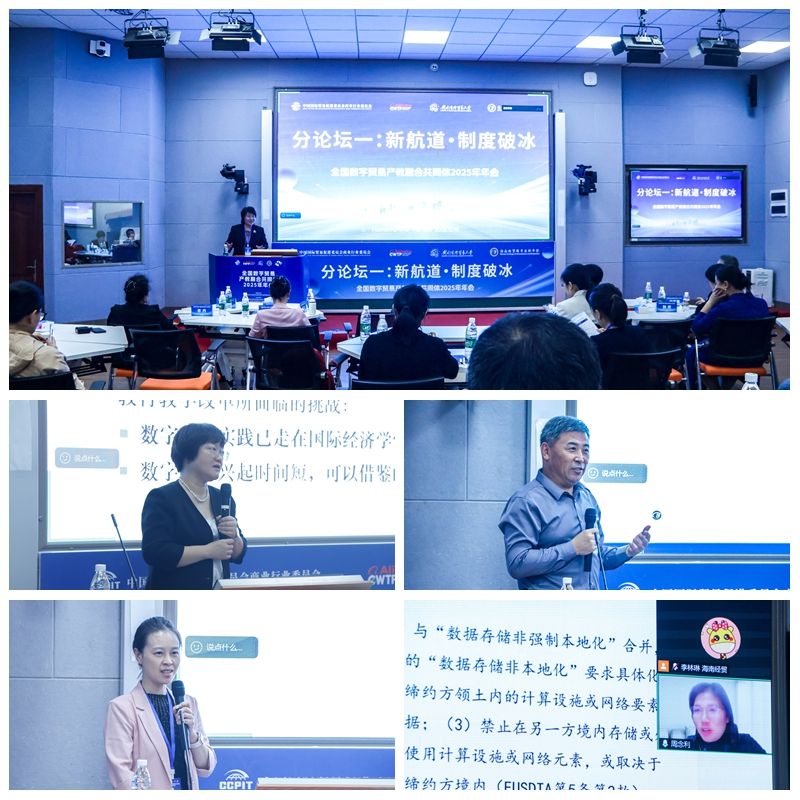 年会设置了主题报告、专题分论坛与圆桌对话等环节。中国国际经济交流中心科研信息部原副部长、高级研究员王晓红和商务部国际贸易经济合作研究院副研究员洪勇分别作“推动数字贸易高质量发展”和“制度创新与产教融合:驱动数字贸易高质量发展的双轮引擎”主题报告。在“制度破冰”分论坛,来自数字贸易教育、职业发展、技术应用与国际规则研究领域的知名专家围绕“数字贸易教育教学资源建设的探索与实践”等内容展开分享。在“万物互联”分论坛,来自企业、协会、高校的专家从产业需求导向的人才培养模式、校企协同构建数字贸易生态、产教融合赋能区域经济发展等多个维度,带来了兼具理论高度与实操价值的独到见解。在圆桌论坛上,围绕“从课堂到全球市场:产教融合驱动数字贸易人才跃进”主题,来自高校、企业和产教融合基地的代表们展开深度交流讨论,为数字贸易产教融合的创新发展和人才培养开辟了新思路。
