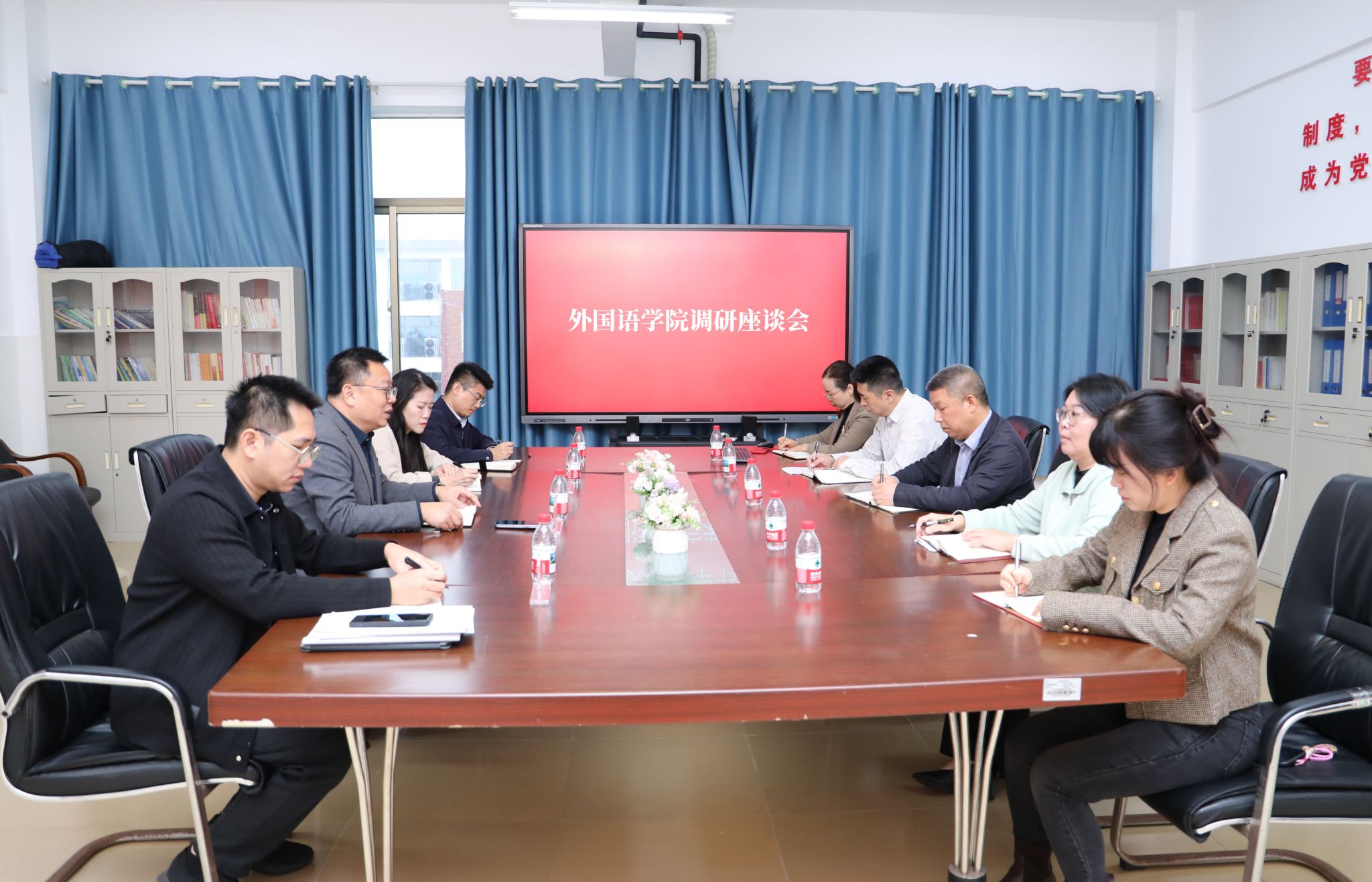 党政办公室、组织人事处、教务处有关负责人陪同调研,外国语学院党政班子成员参加座谈。
