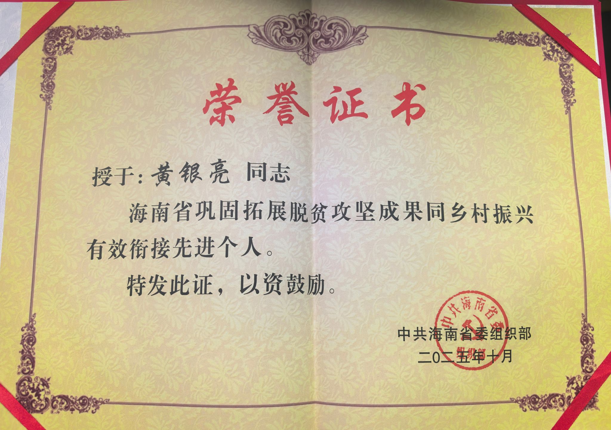 黄银亮荣获“海南省巩固拓展脱贫攻坚成果同乡村振兴有效衔接先进个人”称号 ​