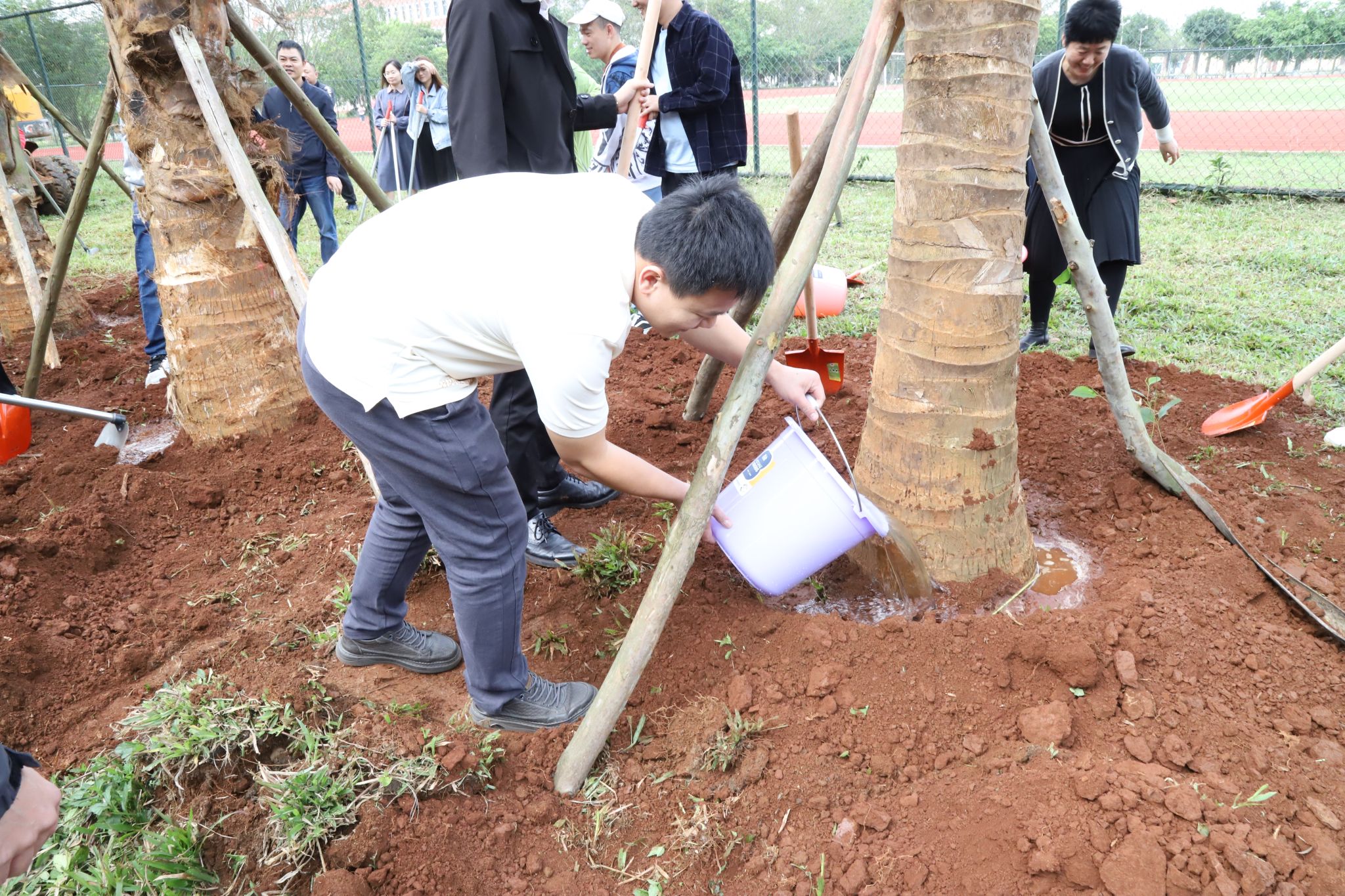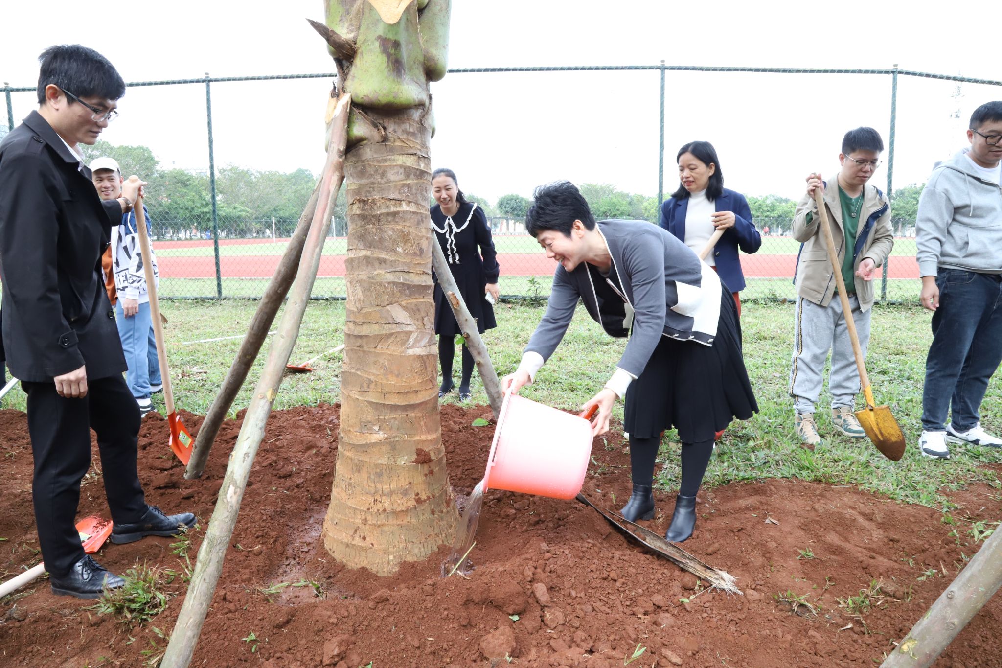 上午10时左右,大家齐聚于教职工宿舍与运动场之间的绿地。工作人员将椰子树苗稳妥地安置在预先准备好的位置上,大家齐心协力,挥动铁锹铲土、筑起围堰、提水浇灌、各司其职,十多棵椰子树在众人的共同努力下,稳固地扎根于土壤之中,傲然挺立,迎风摇曳,展现出勃勃生机。“你是我们种下的,要健康长高长壮哈!”老师和同学们和亲手种下的椰子树“对话”。此次植树活动既是对师生员工的一次生态文明理念教育,更是一次人与自然的亲切交流,是大家对未来希望的共同播种。