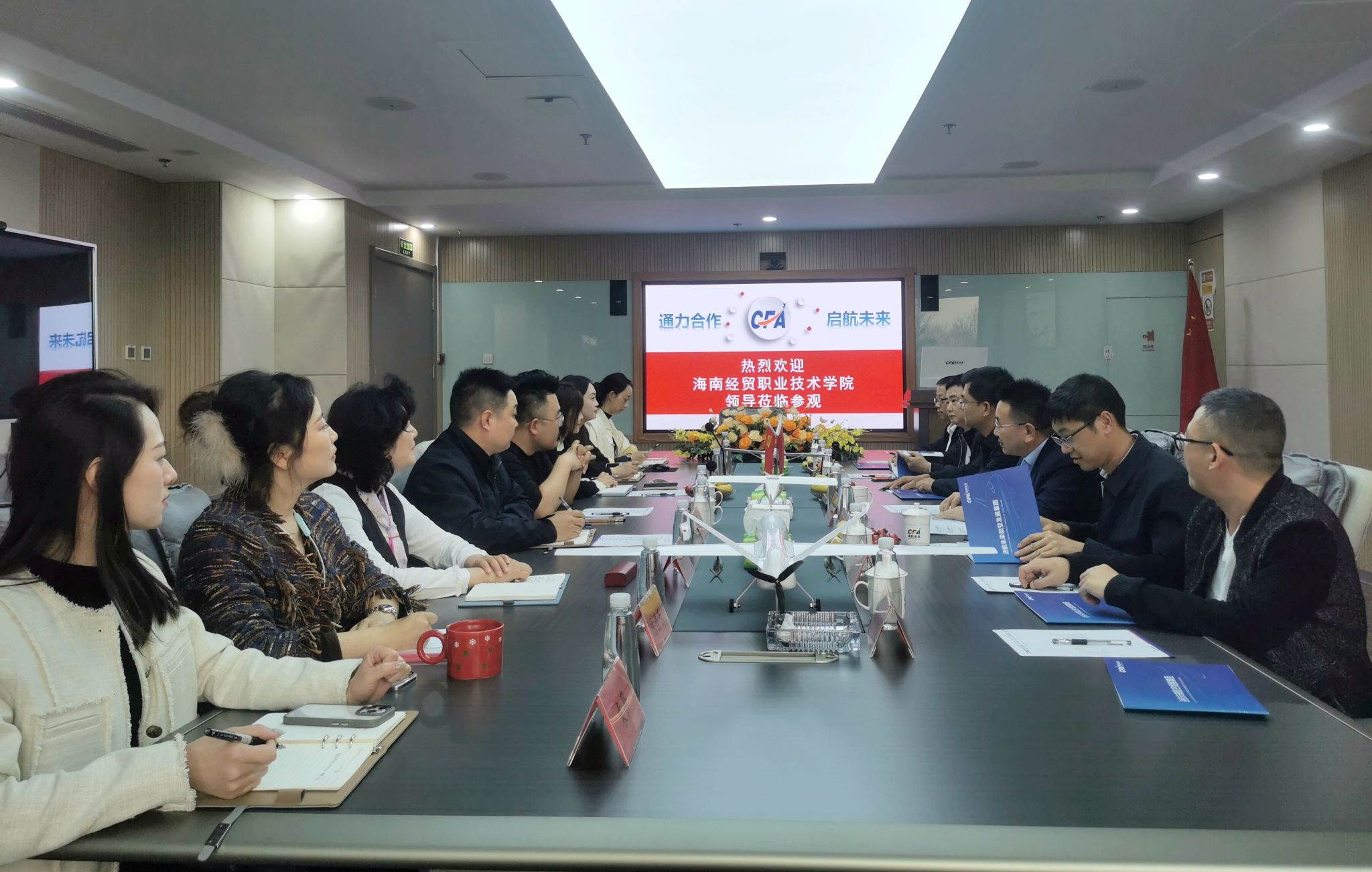 在北京通航未来航空发展集团,董事长马海云对崔昌华一行表示热烈欢迎,并介绍了公司航空职业教育、航空新文旅、航空科技等方面的发展情况,他期望同海经贸在飞机机电设备维修、航空旅游等方面深化产教融合、推进校企合作。崔昌华介绍了学校发展历程、专业建设、校企合作等情况,希望双方能共同推进新领域新专业的校企合作,培养出适应海南自由贸易港建设需求的高素质技术技能人才。双方就产业学院建设、人才培养模式、师资队伍、实训就业等方面进行深入交流。崔昌华一行还参观了平谷航空实训基地和密云飞行实训基地。