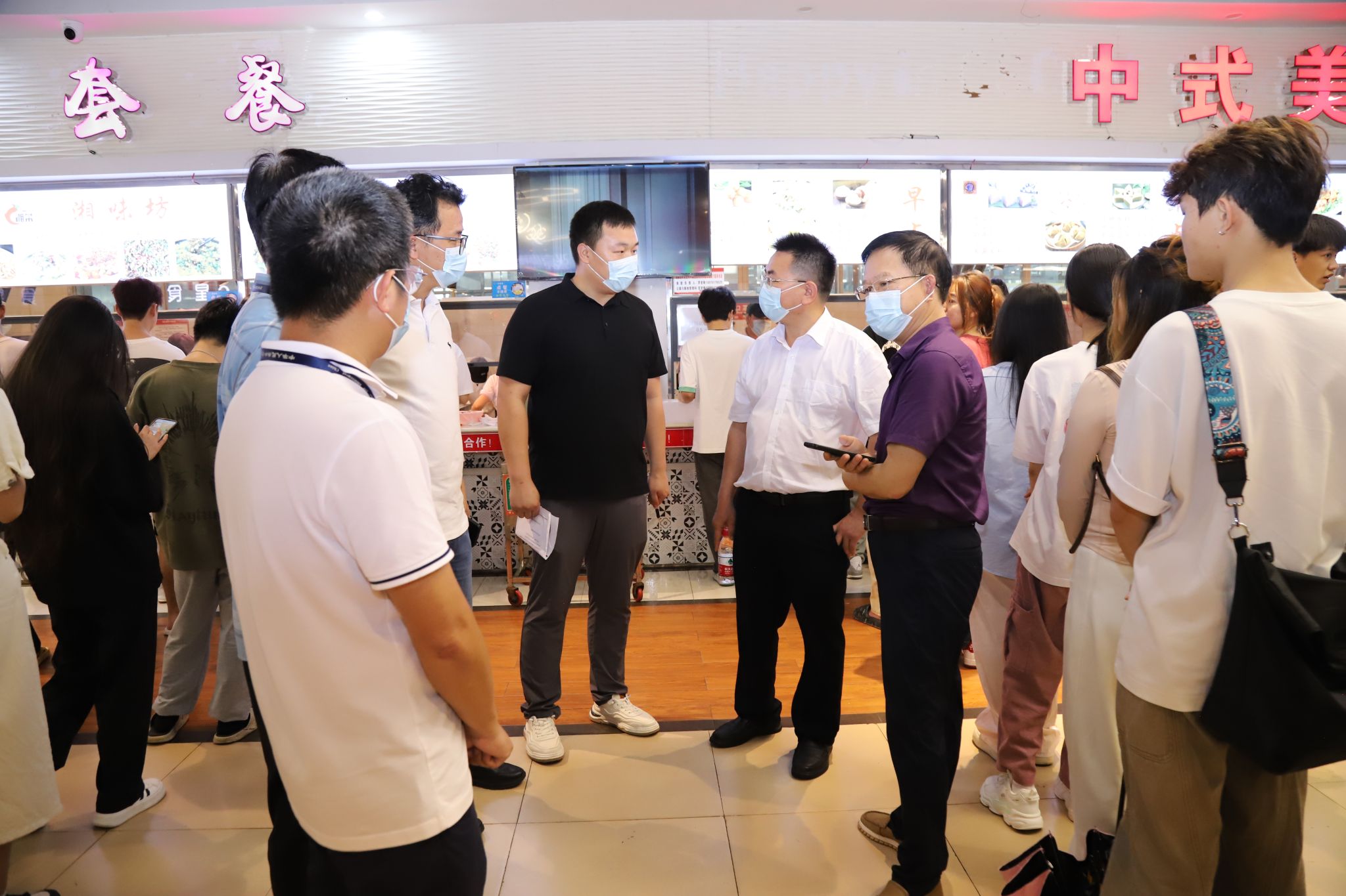 校领导与海口市市场监督管理局桂林洋经济开发区分局、桂林洋高校后勤服务公司有关负责人就食堂卫生、档口经营、校园外卖管理等工作进行交流,并实地走访学校食堂,详细了解各档口的食品原料采购、后厨操作间卫生、食材加工与留样、工作人员健康和师生用餐体验等情况。