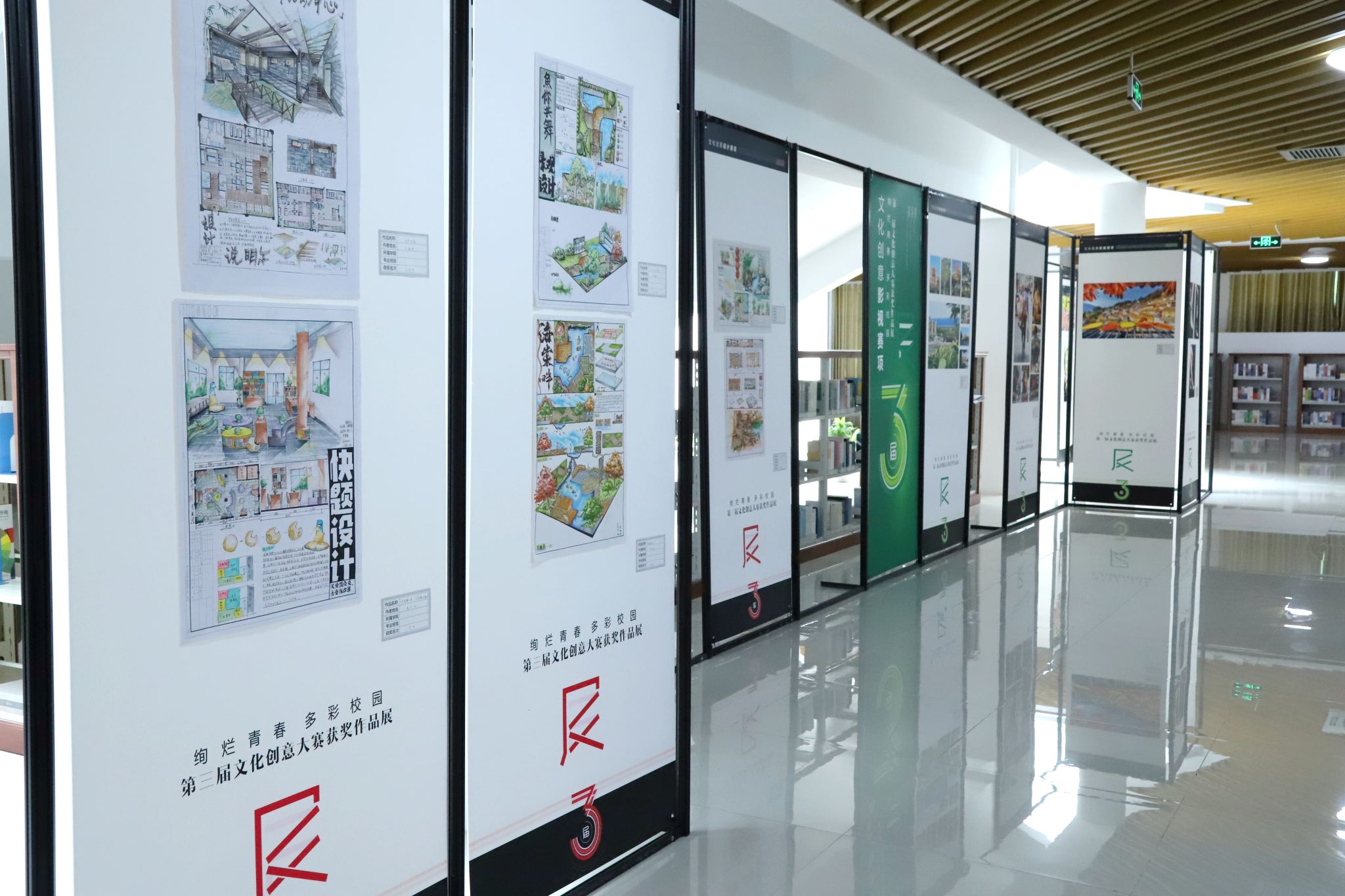 获得比赛一、二、三等奖的学生作品在图书馆中庭展出,作品内容丰富多样,创意十足,充满情感和温度。学子们通过不同的方式表达自己的才华和感悟,有的用镜头捕捉并记录下生活中的精彩瞬间,有的发挥想象力创作出别具一格的文创产品,有的从校园生活出发,用文字抒发对成长和青春的理解。