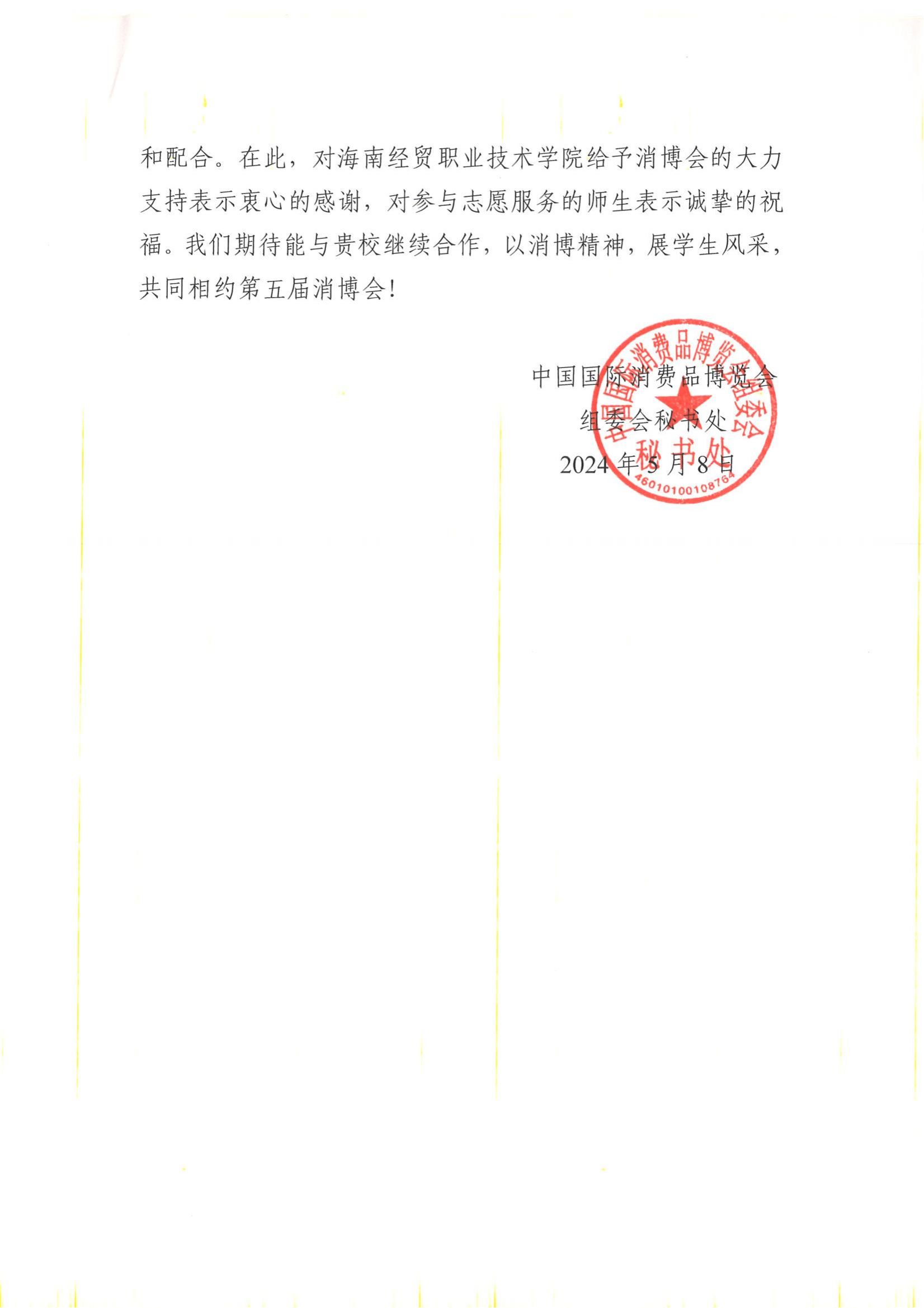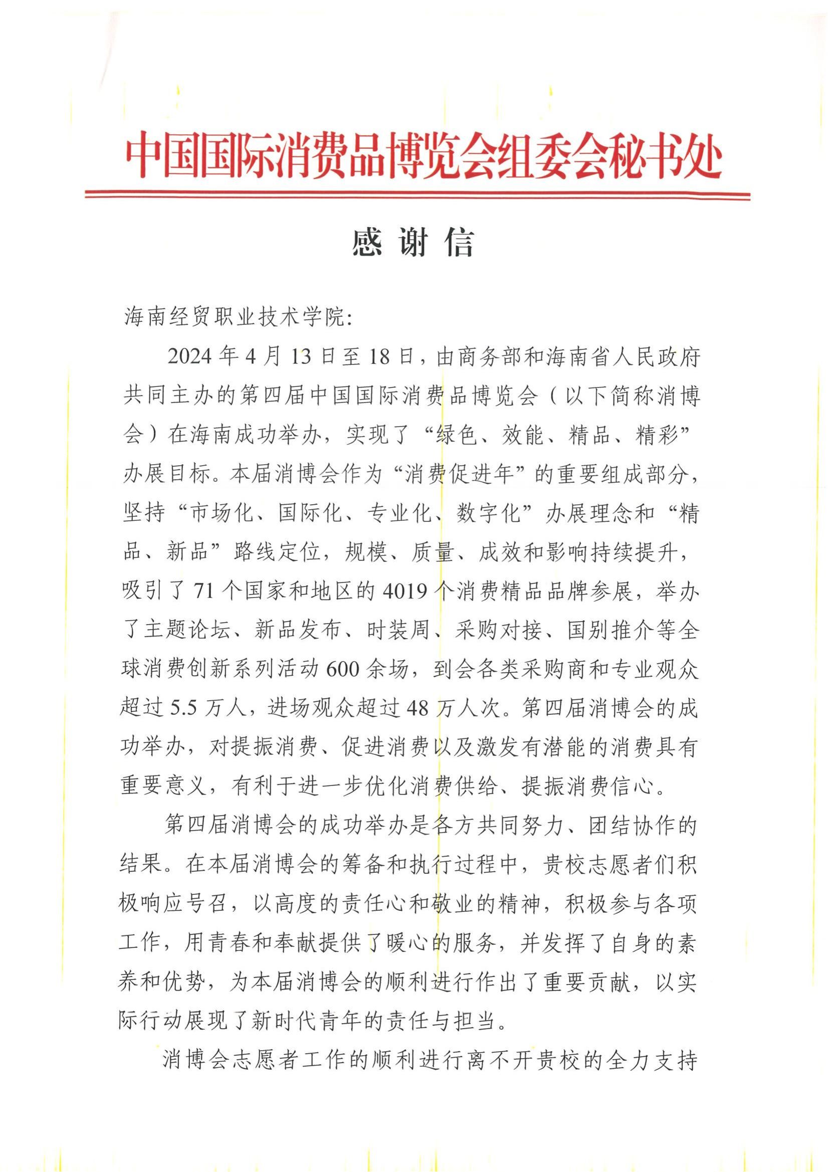 近日,中国国际消费品博览会组委会秘书处向bv伟德源自英国始于1946发来感谢信,对学校师生积极参与第四届消博会志愿服务工作给予高度评价,向学校的大力支持表示感谢并致以敬意。