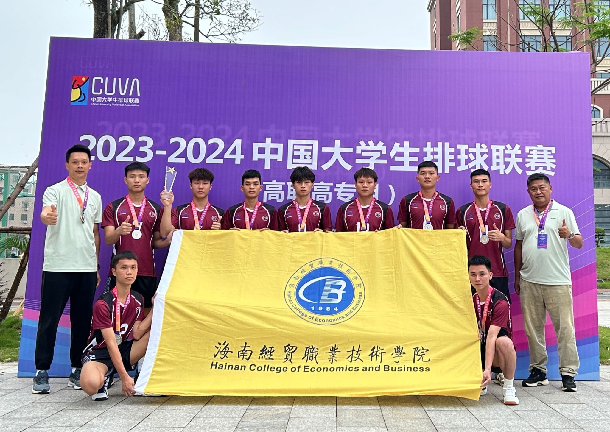 在陈达春教练的带领下,排球队的9名队员们利用课余时间精心准备、刻苦训练、积极备战,打下了良好的身体素质和坚实的技战基础。赛场上,同学们顽强拼搏、越战越勇,打出了士气、比出了风格,彰显了海经贸学子不畏困难、勇于进取的精气神。