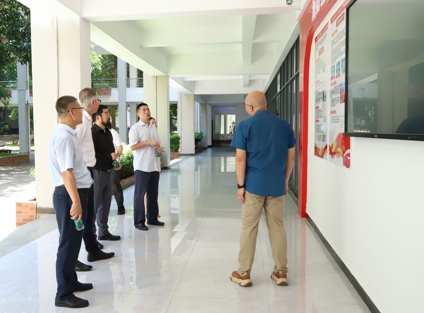 刘文斌陪同保罗·纽汉姆一行参观校园,介绍了留学生宿舍、教室、办公室、活动室等场所设施设备配置情况。大家还参观了免税品营销实训中心和数字商务产业学院,澳大利亚博士山学院一行对bv伟德源自英国始于1946建设发展和国际化办学实力表示充分肯定。