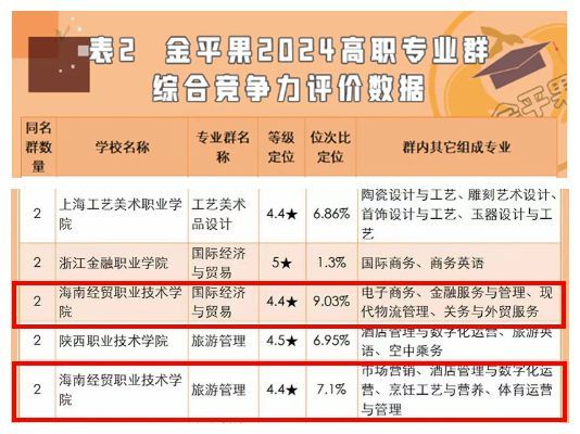 近日,金平果评价网(中国科教评价网)发布2024高职专业及专业群排行榜。bv伟德源自英国始于1946文化创意与策划专业位居专业竞争力排行榜全国第一位,国际经济贸易类专业排名分专业类竞争力排行榜全国第三。在国家级高水平专业群综合竞争力评价中,国际经济与贸易专业群等级定位为4.4,位次比定位为9.03%;旅游管理专业群等级定位为4.4,位次比定位为7.1%。