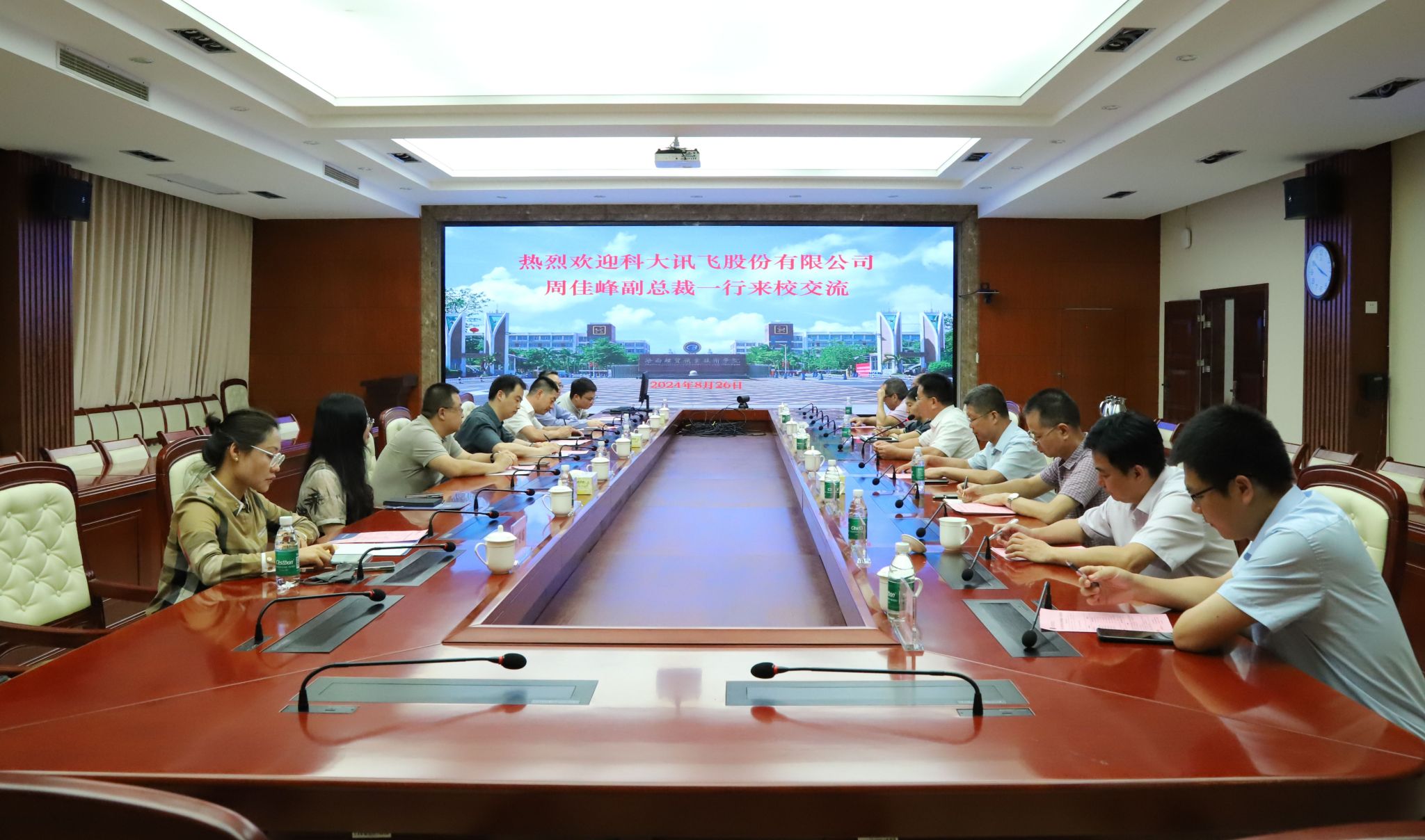 2024年8月26日,科大讯飞股份有限公司副总裁周佳峰一行8人来到bv伟德源自英国始于1946,就校企深入合作进行调研交流。学校党委副书记、校长崔昌华,党委委员、副校长刘文斌热情接待了周佳峰一行。