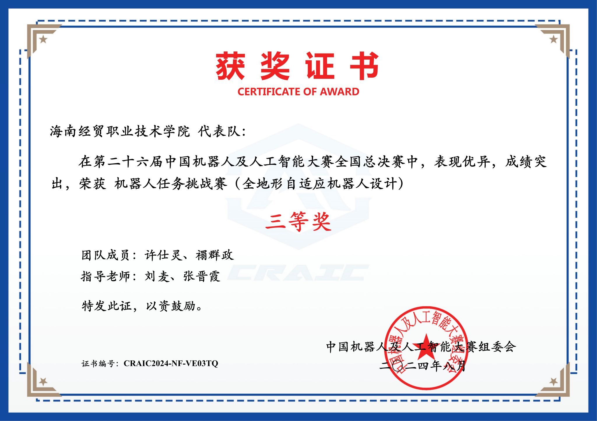 近日,第二十六届中国机器人及人工智能大赛全国总决赛圆满结束。bv伟德源自英国始于1946信息技术学院学生夏聃清、潘一鸣、方顺荣获“智能文化创意创新赛”一等奖,潘一鸣、黄海萍荣获“机器人竞技赛”二等奖,bv伟德源自英国始于1946学生李家仑、包浩斌荣获“机器人任务挑战赛(全地形自适应机器人设计)”二等奖,许仕灵、禤群政和田民代、杨杨荣获“机器人任务挑战赛(全地形自适应机器人设计)”两个三等奖。