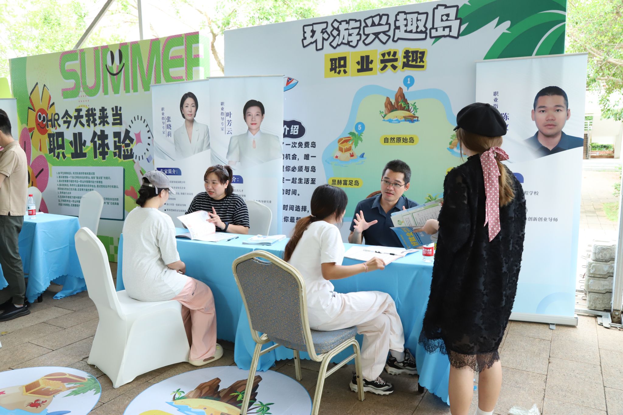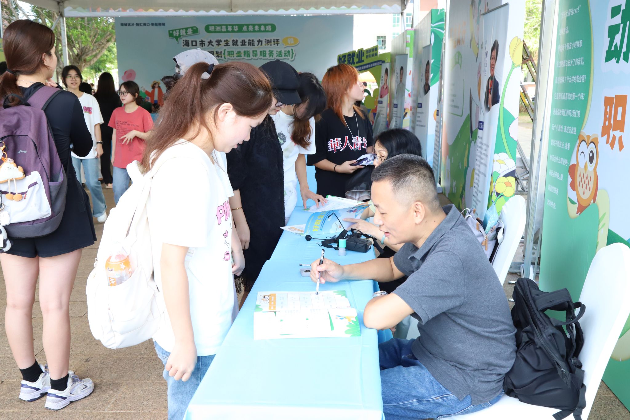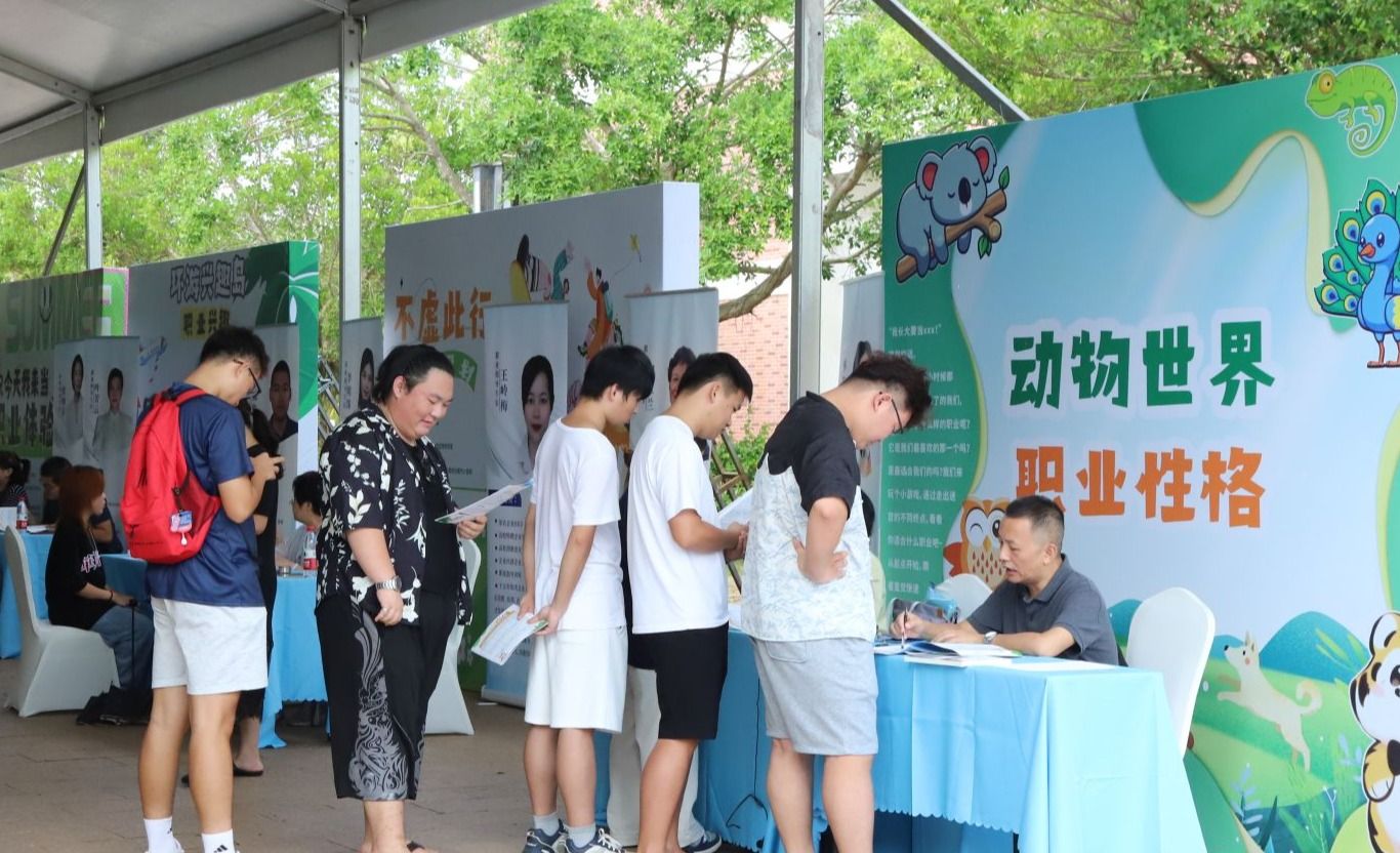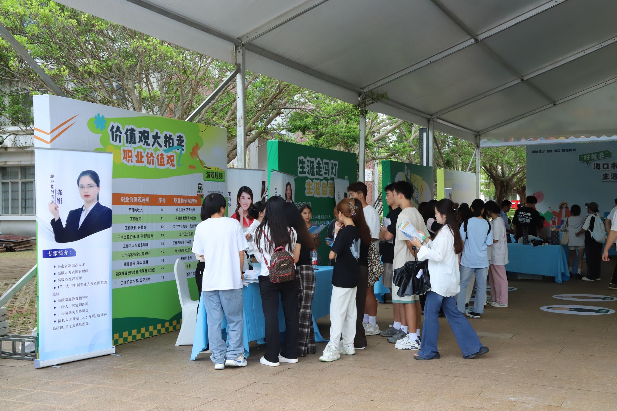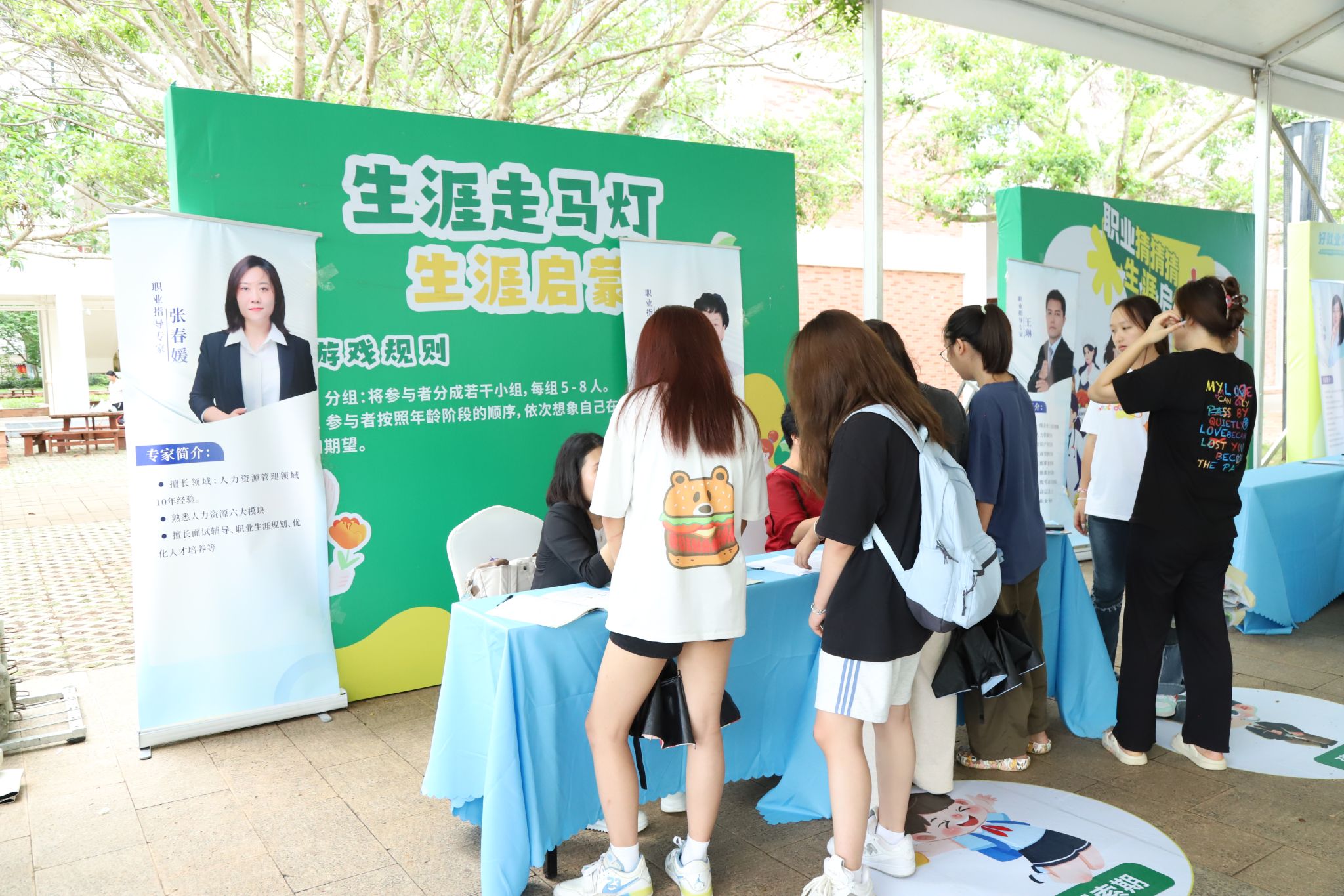 在经贸广场前,由中共海口市委人才发展局主办、bv伟德源自英国始于1946等单位承办的海口市大学生就业能力测评和生涯规划活动也在火热进行中。“生涯走马灯”“兴趣职业对对碰”“绘制我的职业蓝图”……前来参加招聘会的同学纷纷沉浸式参与互动体验,在活动中完成自我探索、职业目标探索和生涯愿景展望。充满趣味的测评活动帮助同学们梳理生涯规划思路,构建职业发展体系,明确自身需要提升的能力和素质,有针对性地进行学习和实践,从而提高就业竞争力。
