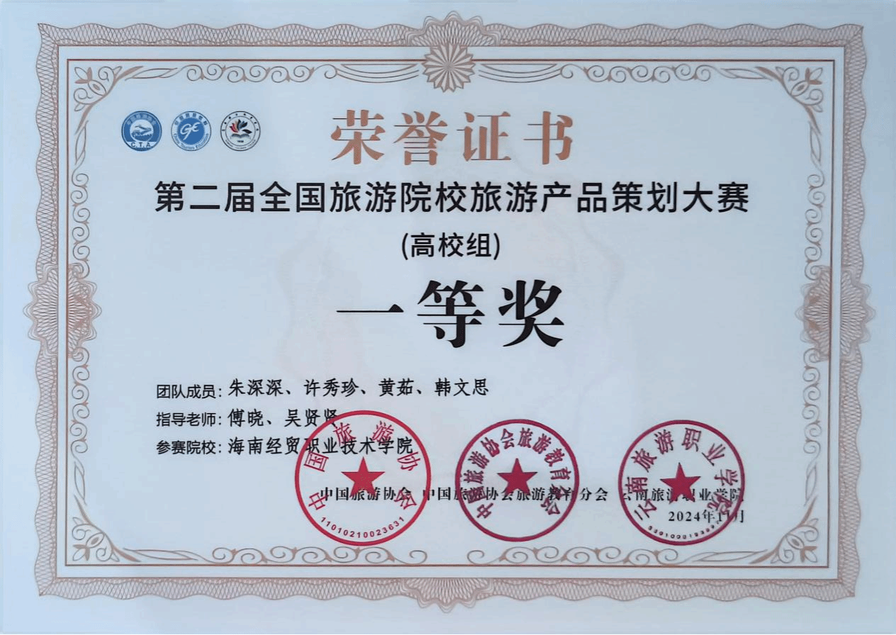 2024年11月14日-16日,由中国旅游协会主办的全国旅游院校旅游产品策划大赛全国总决赛在云南昆明顺利落幕。bv伟德源自英国始于1946国际旅游学院学生朱深深、许秀珍、黄茹、韩文思组成的参赛团队获得高校组一等奖。这是海南高校参加全国旅游院校旅游产品策划大赛首次入围总决赛并获奖。