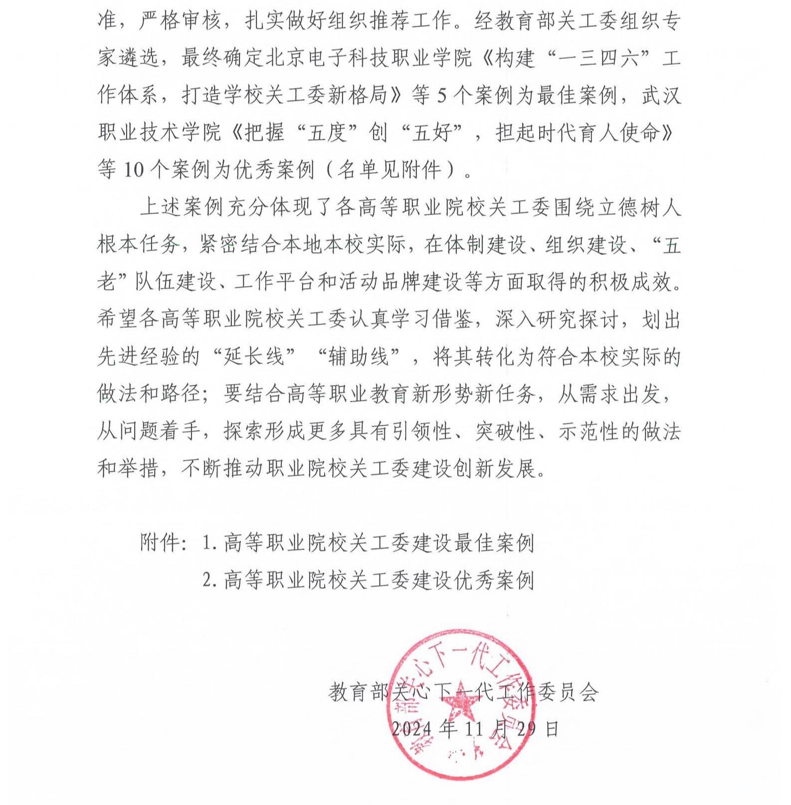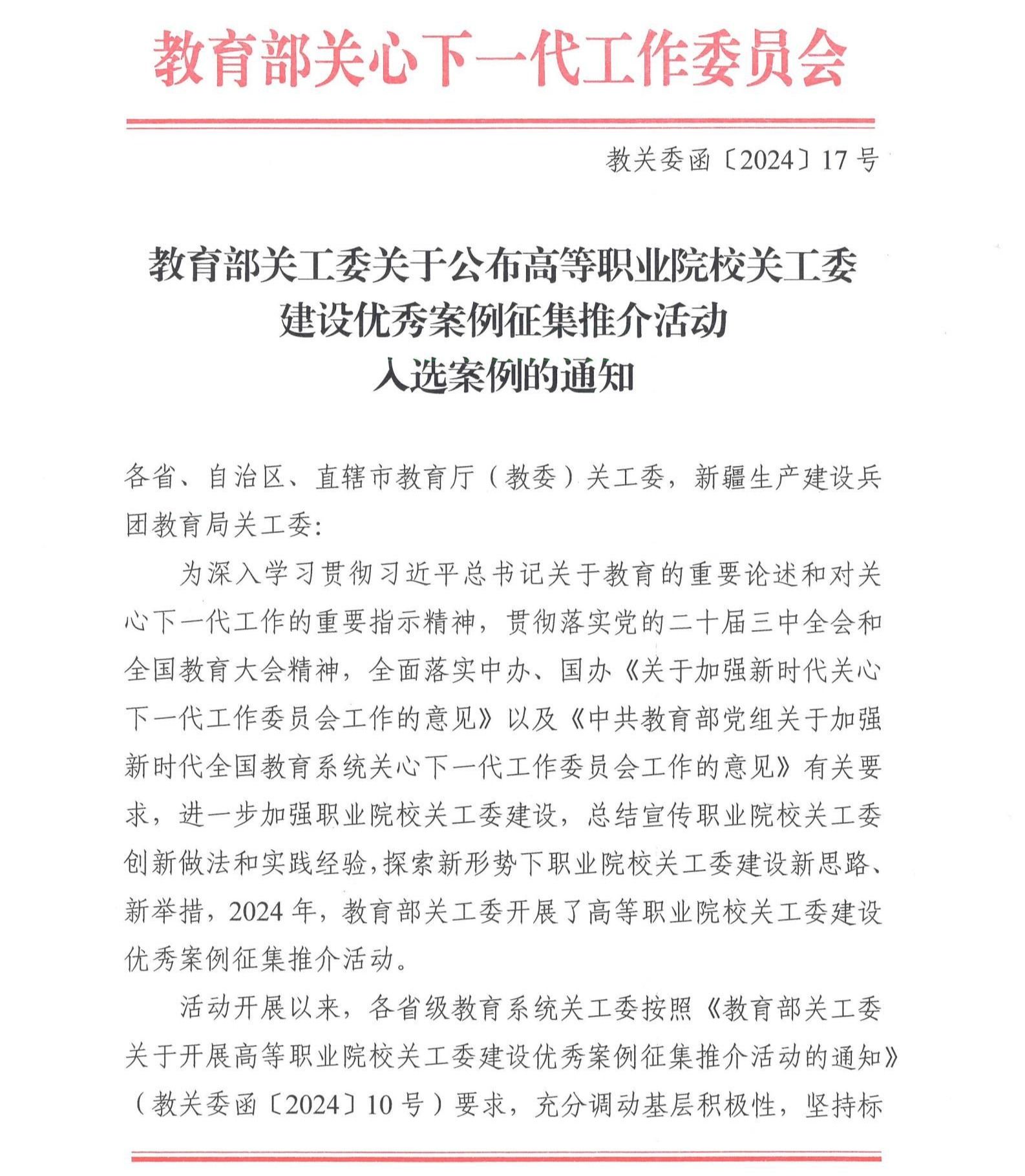 教育部本次评选旨在进一步加强职业院校关工委建设,总结宣传职业院校关工委创新做法和实践经验,探索新形势下职业院校关工委建设新思路、新举措,经各省级教育关工委推荐,教育部关工委组织专家遴选后,最终确定5个案例为最佳案例,10个案例为优秀案例。
