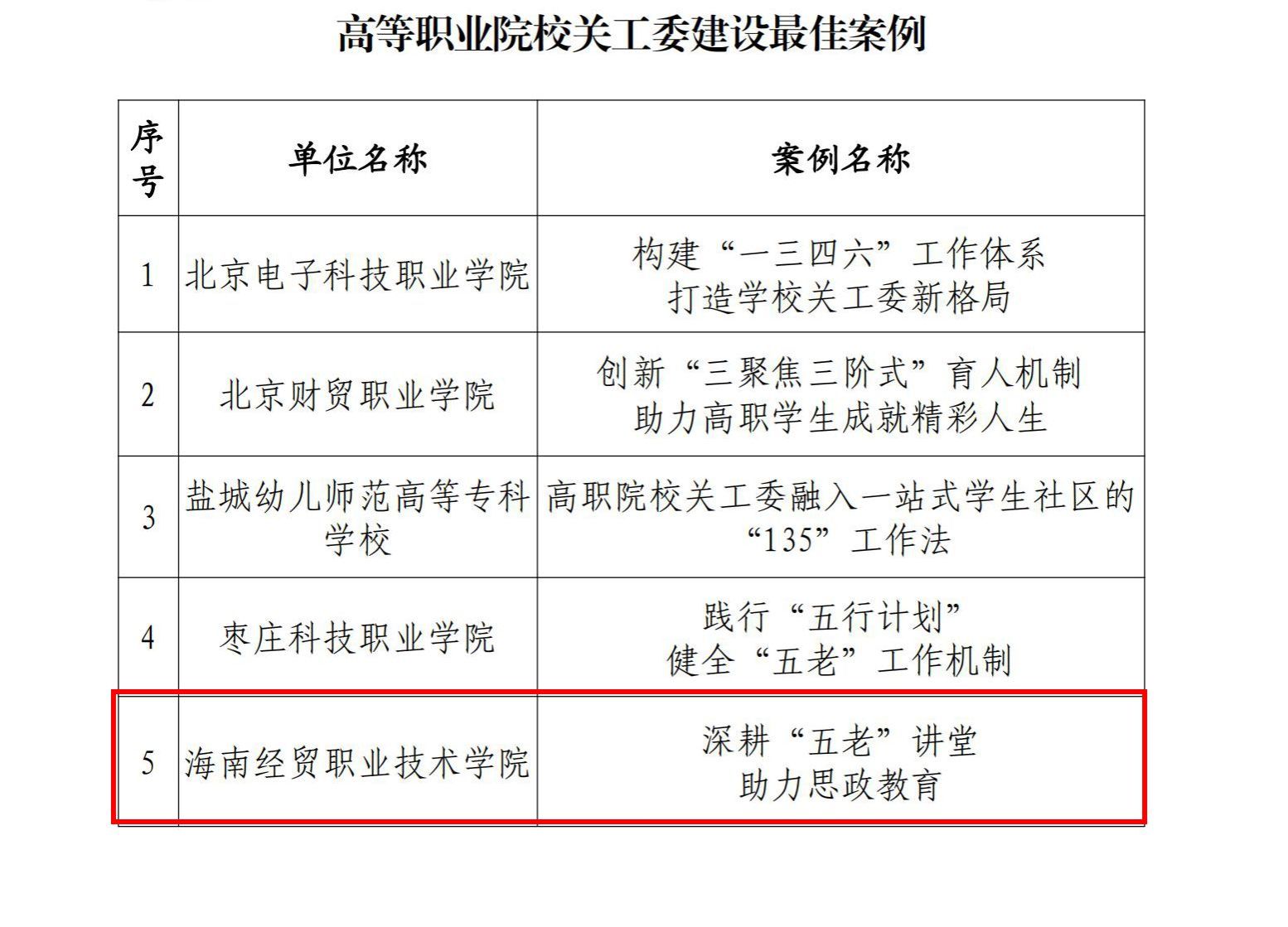 2024年11月29日,教育部关心下一代工作委员会公布高职院校关工委建设优秀案例征集推介活动入选案例,bv伟德源自英国始于1946关工委申报的《深耕“五老”讲堂,助力思政教育》入选最佳案例,是海南省唯一入选案例。