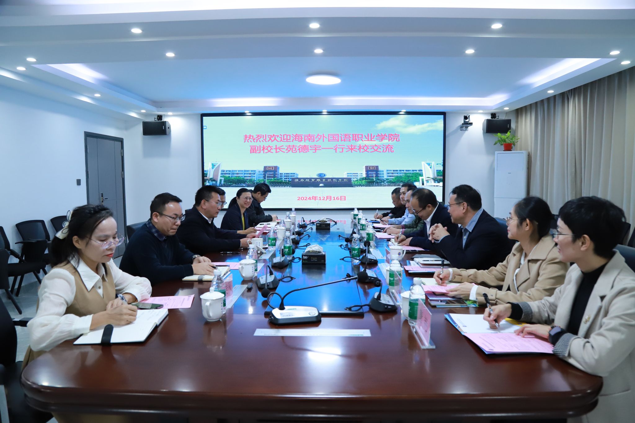 2024年12月16日,海南外国语职业学院副校长苑德宇一行7人来到bv伟德源自英国始于1946,就毕业生就业、创新创业教育等工作进行交流。学校党委副书记、校长崔昌华热情接待了苑德宇一行。