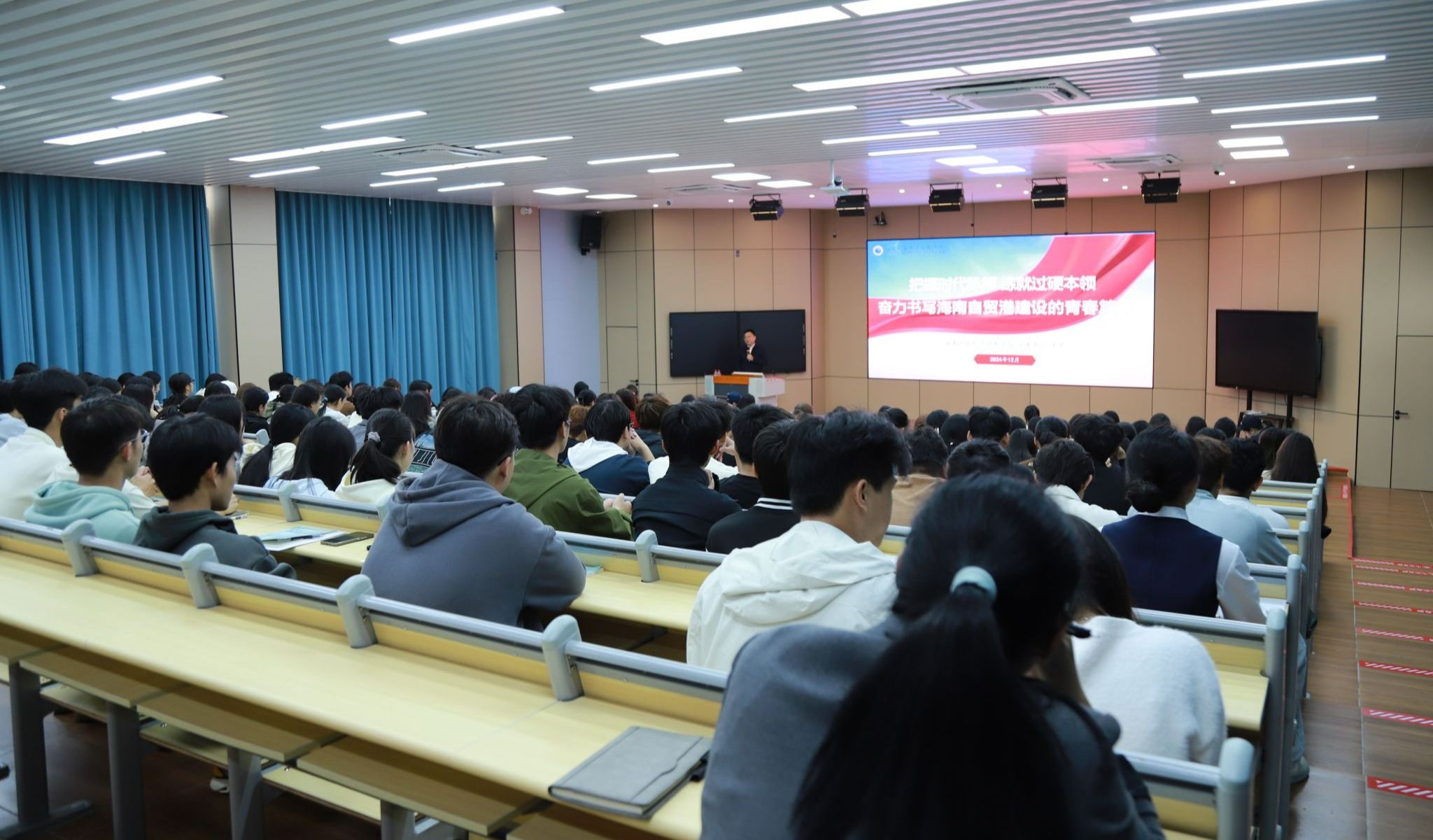 “同学们,请问你对海南自由贸易港有哪些了解?”王华以“把握时代脉搏 练就过硬本领 奋力书写海南自贸港建设的青春篇章”为题,围绕国家改革开放以来翻天覆地的变化、海南改革开放历程和海经贸40年的发展建设以及青年人的时代担当等方面进行讲述。结合鲜活的案例,他深入阐释了党的二十届三中全会的重大意义、重大举措,详细讲解了海南争当新时代改革开放示范的有关部署,与同学们一起交流探讨,畅谈发生在大家身边的变化,勉励同学们把握时代脉搏,树立高远的志向,锤炼高尚的品德,练就过硬的本领,以青春之姿在新时代挺膺担当。