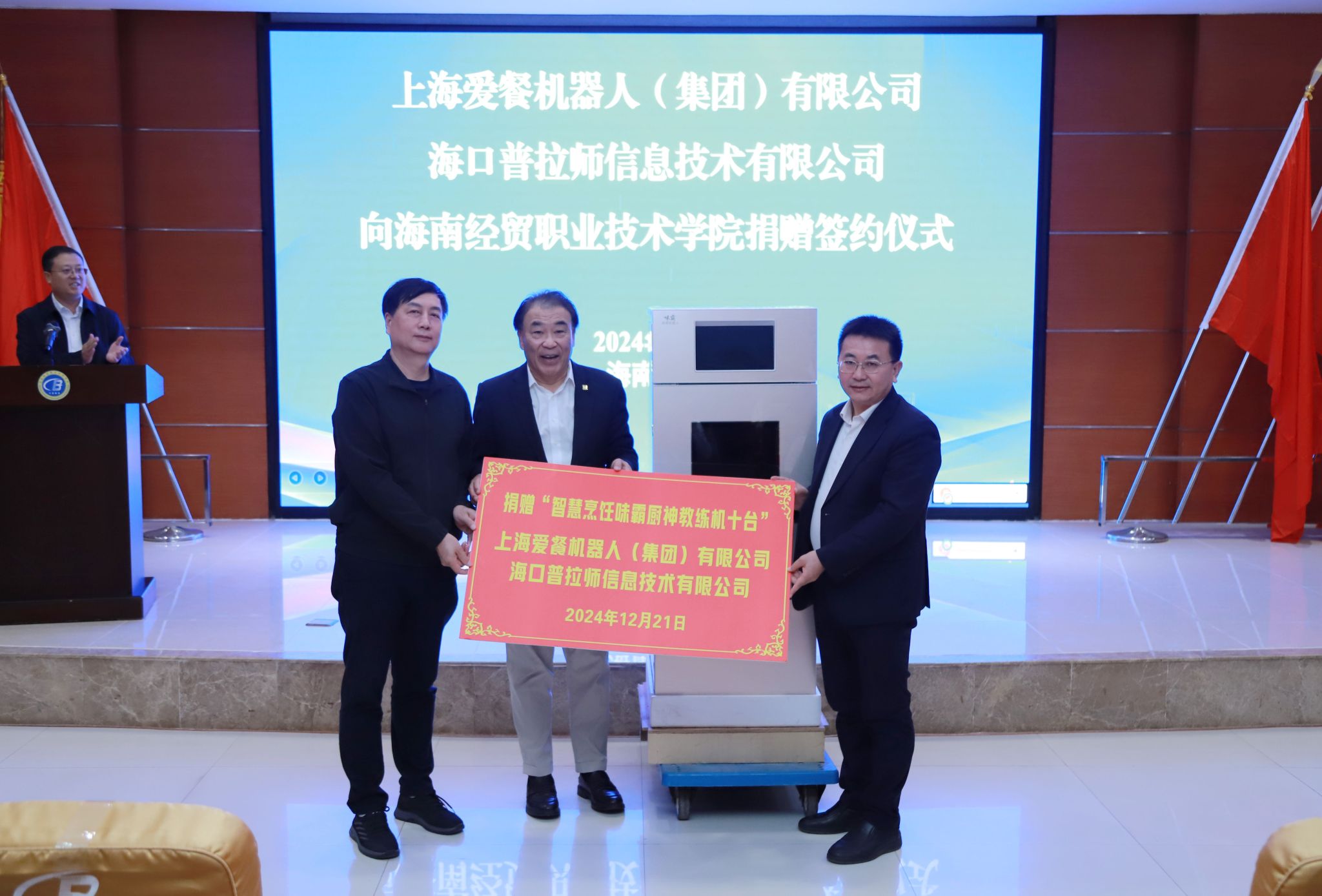 活动现场举行了捐赠签约和捐赠设备交接仪式。上海爱餐公司向海经贸捐赠 10 台厨神教练机,专用于学校智慧烹饪实训室教学。海口普拉师公司作为上海爱餐公司的本地服务商,将协助完成设备的安装调试,为学校提供后续技术支持。学校接受捐赠,并设立爱餐智慧烹饪实训室。