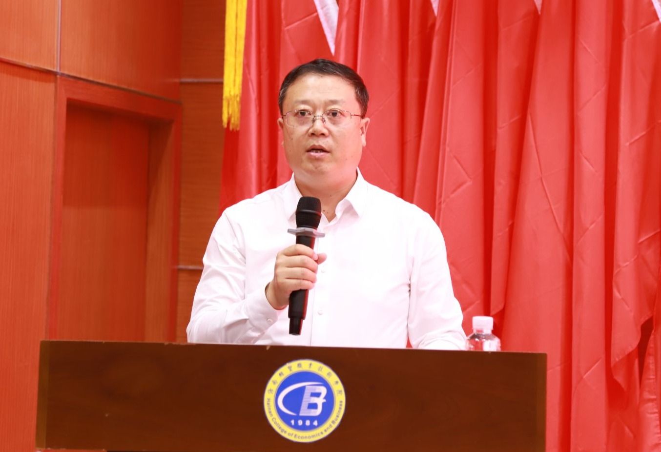 教师代表郭延江向同学们提出学习建议,并代表所有教师作出庄严承诺,将竭尽所能为大家提供优质教学服务,祝愿新生学有所获、学有所成。