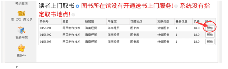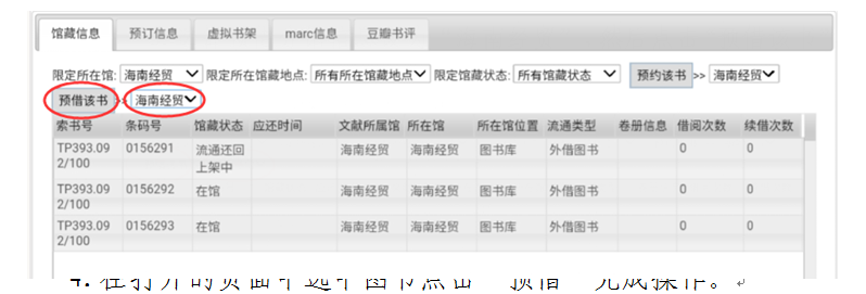 3.选择预借分馆信息设为“海南经贸”,然后点击“预借该书”,