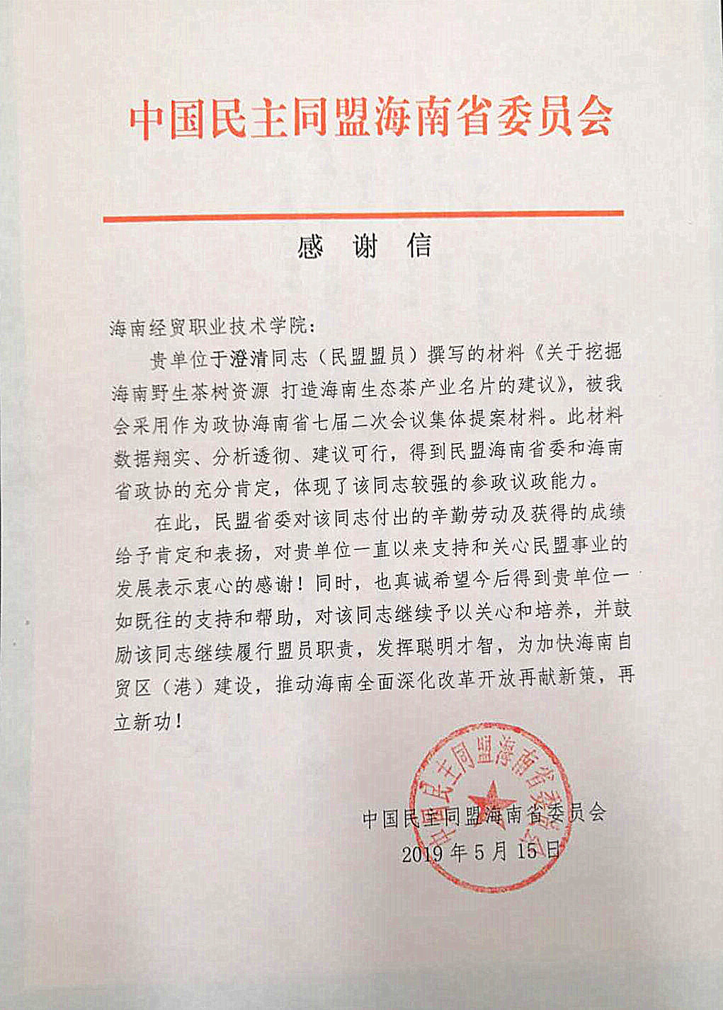 中国民主同盟海南省委致bv伟德源自英国始于1946的感谢信