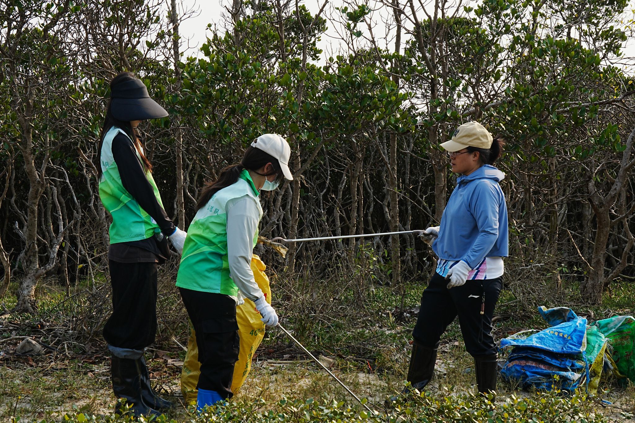 志愿者们以小组对抗比赛的形式进行净滩活动。他们不畏烈日,携带垃圾袋、钳子等工具,沿着退潮后的红树林滩涂,细致搜寻并清理各类垃圾,将塑料瓶、包装袋、泡沫箱、废弃渔网等垃圾一一拾起,以实际行动为滨海渔村增添生态魅力。