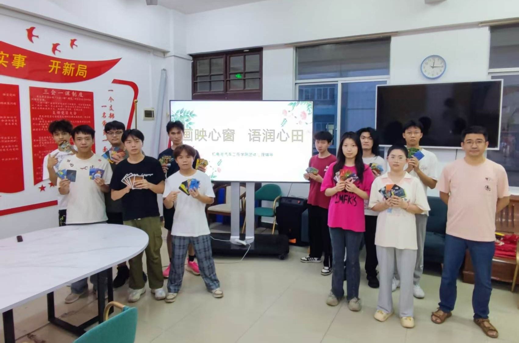 在“你画我猜”破冰游戏中,同学们通过肢体语言与简笔画传递抽象概念,在欢笑中打破陌生感,迅速点燃现场氛围。在活动核心环节 ——“卡牌分享”,大家随机抽取《画物语》卡牌,根据卡牌图案自由创作,表达抽象复杂的情感。同学们在协作中理解他人视角,重构对压力与挑战的认知,提升心理韧性。