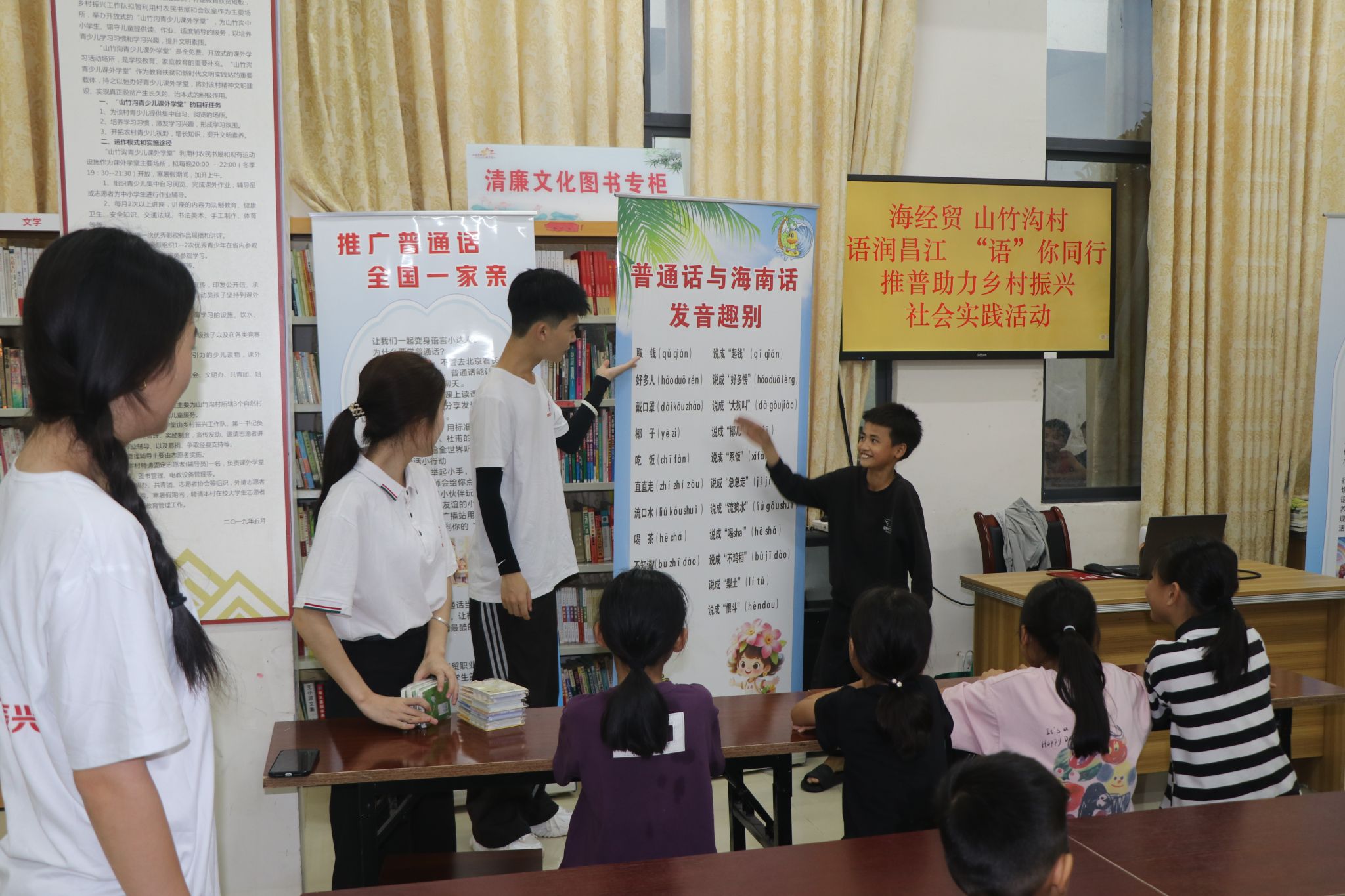 期间,队员与孩子们共同完成《少年中国说》集体朗诵、普通话绕口令挑战、古诗词规范书写,并通过“普通话与海南话发音对比”讲解、识字拼图、“你比划我来猜”等趣味游戏,打造“经典诵读+方言文化碰撞+趣味互动”的沉浸式推普体验,让普通话以鲜活方式融入乡村孩子日常,在潜移默化中厚植语言文化传承使命感,提升以语言反哺家乡的社会责任感。针对昌江黎族自治县学生常见的发音误区如平翘舌混淆等问题,实践队员结合实例耐心示范纠正、开展教学。