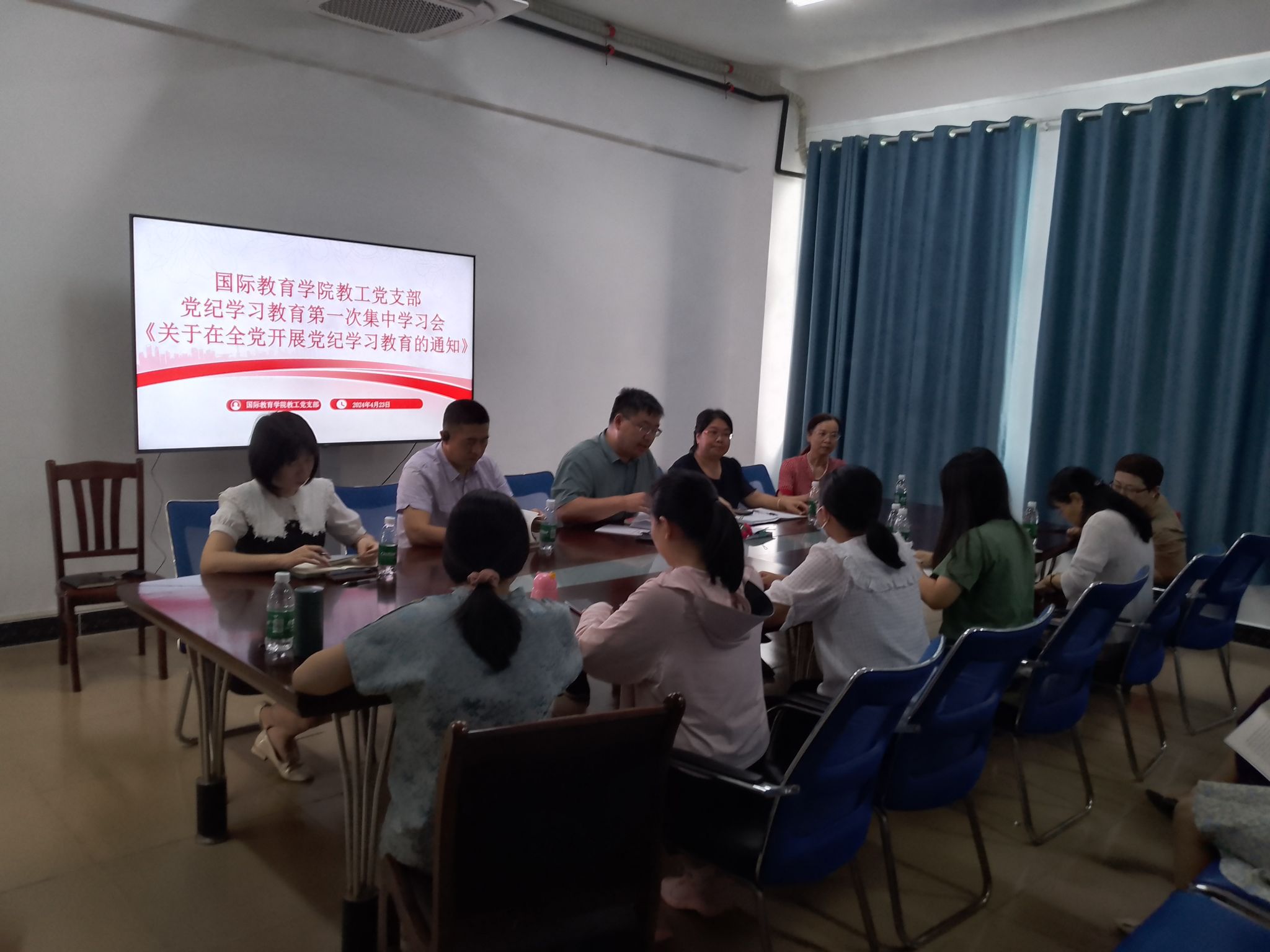 2024年4月23日,国际教育学院党总支召开理论学习中心组学习会,进行党纪学习教育第一次集中学习。学院班子成员、理论学习中心组成员参加学习。