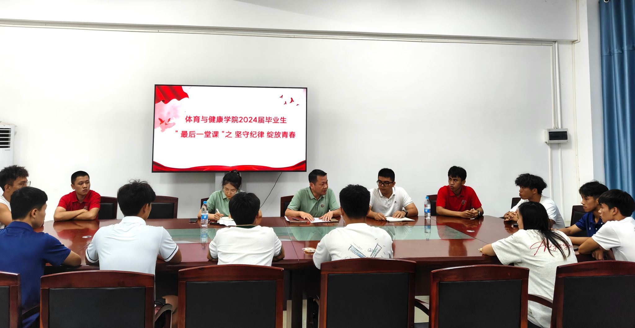 2024年6月19日,,体育与健康学院党总支书记曹迪伟以“坚守纪律 绽放青春”为主题,为2024届毕业生党员上了一堂生动的党课。他教育引导毕业生党员牢记党员身份,不断增强纪律意识和提升党性修养,勇毅前行,做新征程的主力军,做新时代的追梦人。