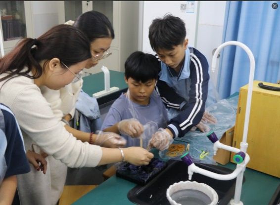 志愿者们通过生动的讲解、精彩的演示和互动体验环节,向中学生们介绍了剪纸、花灯和扎染三项国家级非物质文化遗产的历史渊源、艺术特色与制作技巧。在剪纸展示教室里,同学们被精美的剪纸作品深深吸引,在志愿者的耐心指导下,纷纷拿起剪刀和彩纸,亲手尝试剪出自己喜爱的图案。另一间花灯描绘教室中,同学们接过形状不同的纸糊花灯,在志愿者的传授下巧妙地绘制出龙凤、花鸟等各种图案。灯一亮,惊艳了四座。扎染体验室内则充满了创意与惊喜。同学们发挥想象力,将白色的布料染成了色彩斑斓、独一无二的艺术品。
