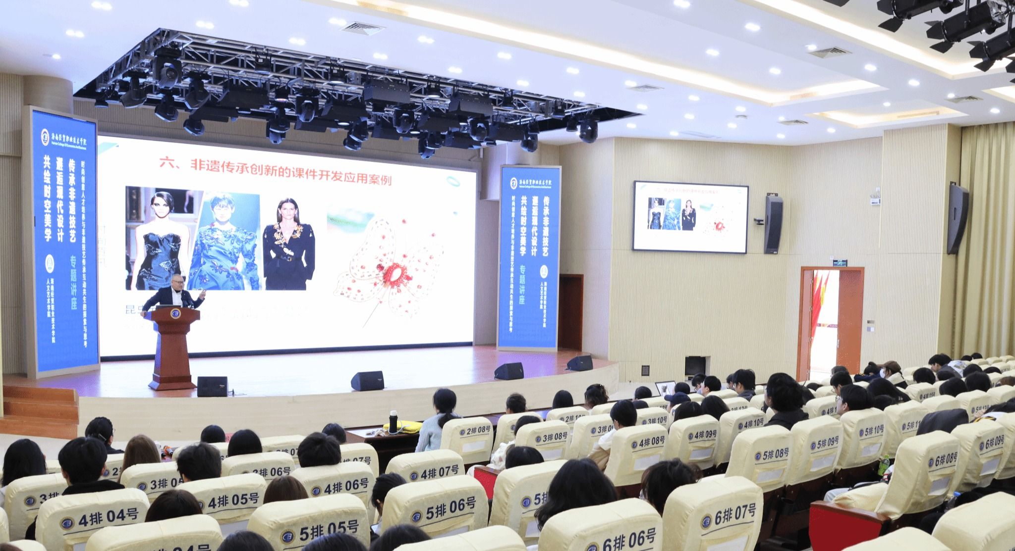 陈桂林从人工智能创意变革、数字化服装设计与智造、非遗与现代时尚等方面,分享了自己关于时尚与行业前沿领域的观点,提出了对非遗技艺传承发展的思考,传递出对创意产业的热情与期待,强调职业院校在非遗传承融合发展发挥着重要作用,在培养新一代非遗项目管理运营人才、非遗代言人等方面具有巨大潜力。同学们表示,陈教授的精彩分享不仅开阔了眼界,也点燃了心中对非遗传承的无限热情与坚定信念。