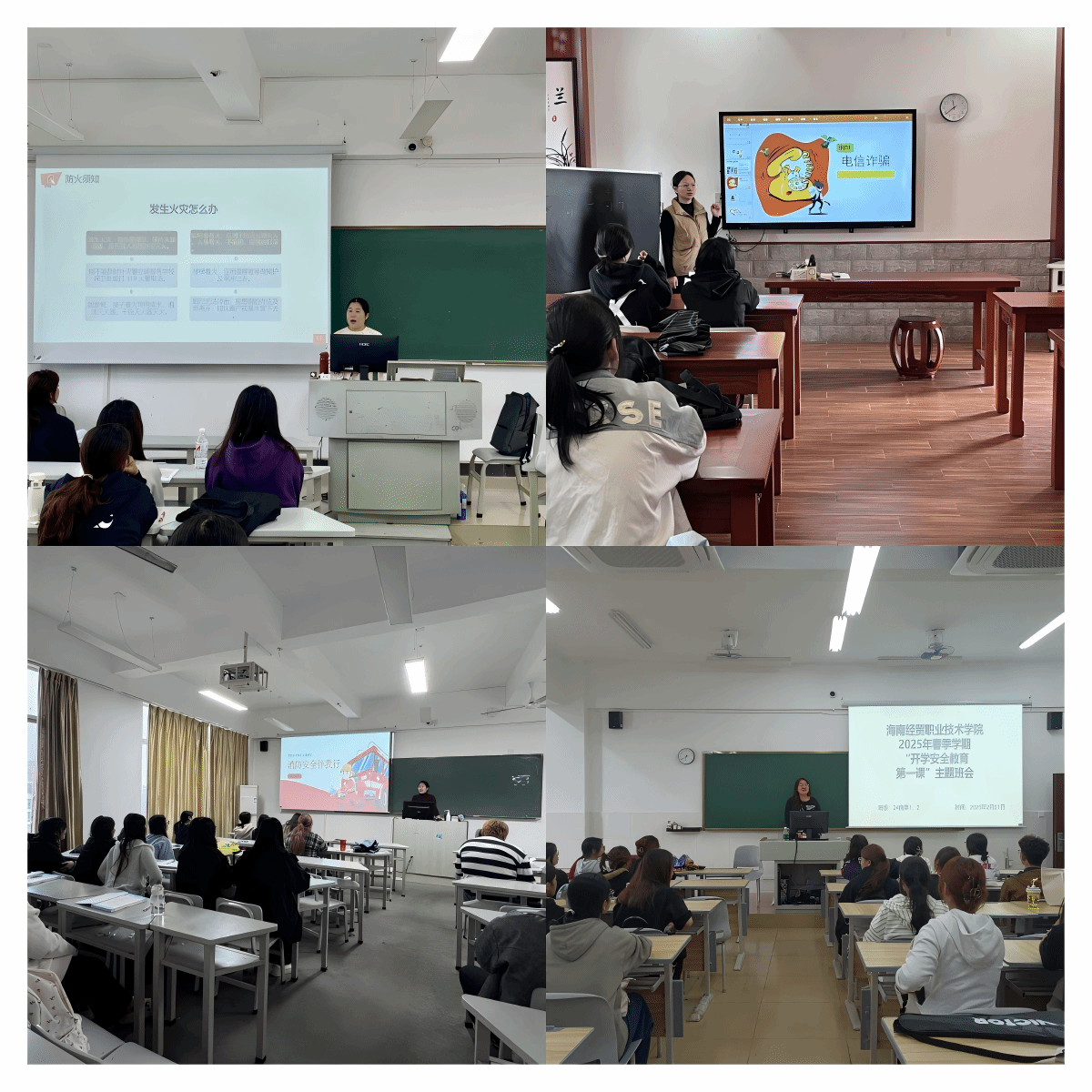 学院召开年级安全教育大会,组织各年级班主任召开"安全第一课"主题班会。班主任重点围绕防诈反诈、消防安全、交通安全、食品安全、心理调适以及学业指导等内容,对学生进行专题教育,引导同学们珍惜生命,作自己健康的第一责任人。